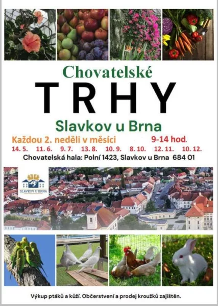 ZO ČSCH Slavkov u Brna pořádá v chovatelské hale v Polní ulici pravidelný trh zvířat. Zajištěn výkup králičích kůží, prodej krmiv, prodej nosnic a výkup exotického ptactva