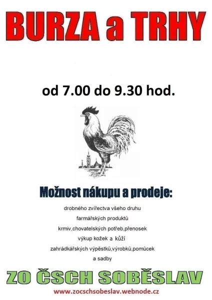 Burza a trhy se konají v chovatelském areálu. Možnost nákupu a prodeje drobného zvířectva všeho druhu, farmářských produktů, krmiv, přenosek a dalších chovatelských potřeb.