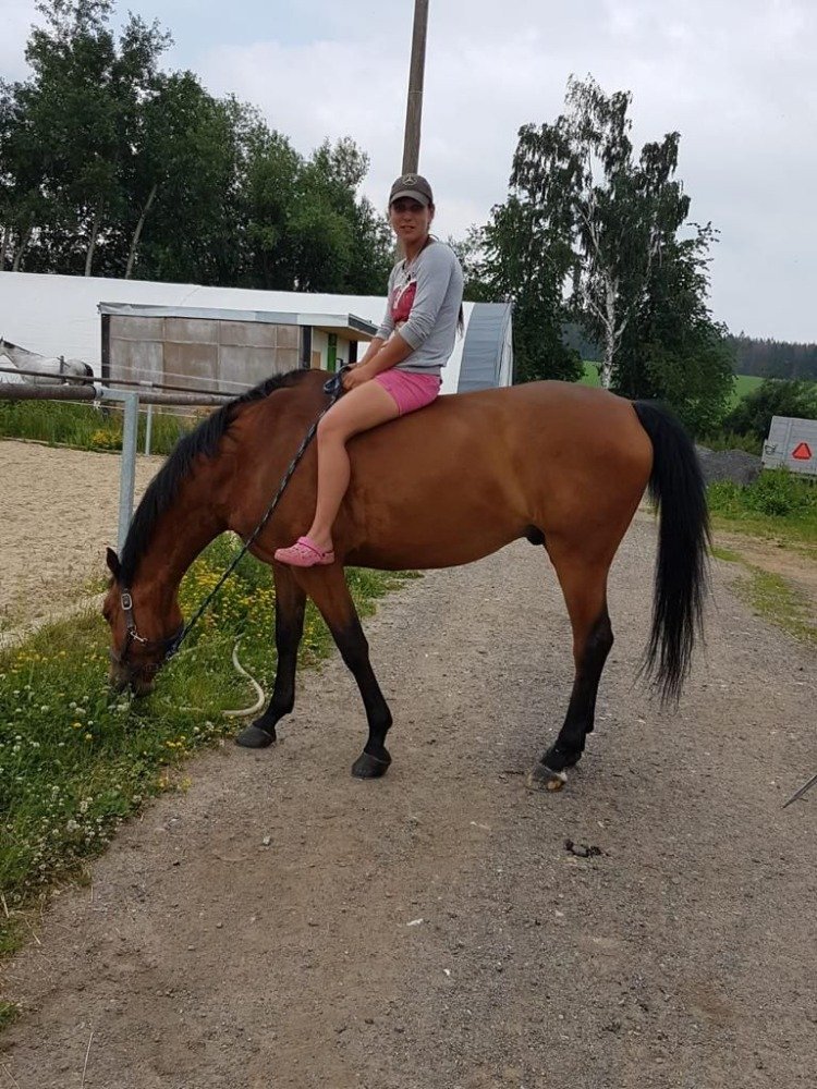 Ale vrátila bych se ještě k Waylonovi. To byl takovej autistickej blázen. Dostal se k nám s hodně špatnou zkušeností s lidmi. A panicky se bál, všeho a všech. Nicméně to, co jsem s ním dokázala byl můj asi životní úspěch. Byl to neobsednutelný (čti „chtěl zabít asi každého, kdo se na něj snažil šáhnout“). Například mi trvalo 2 měsíce se dotknout jeho zadní nohy. Nasadit uzdečku nebo ohlávku bylo, jak krotit divokého tygra… Na kováře jsme ho museli přispávat… Cizí lidi vykopal z boxu. A i přesto všechno jsme si k sobě našli cestu. Byl taková moje spřízněná duše. A nakonec z něj byla stájová jednička s výkonností v parkuru 130 cm s potenciálem výš. Bohužel v roce 2021 dostal komplikovanou koliku a uhynul. To mě zlomilo tak, že jsem s jezdectvím málem sekla.