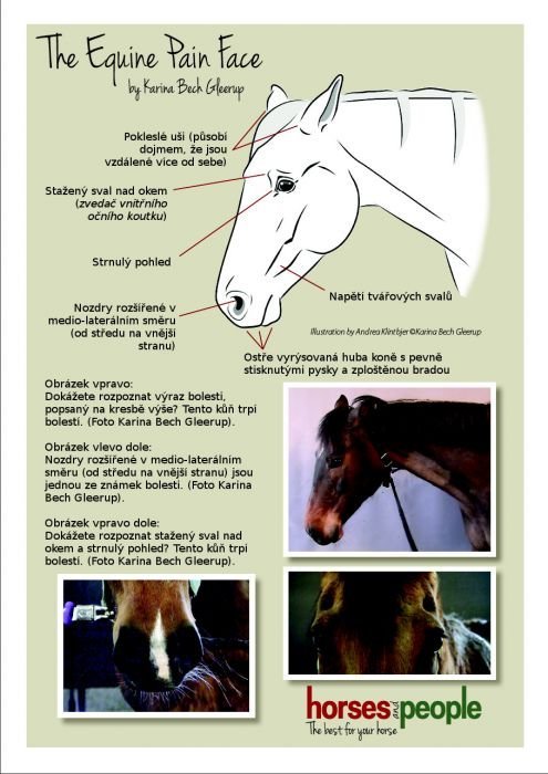 Mimoto vám v základní orientaci může pomoci tento „plakátek“, vypracovaný výzkumným týmem v čele s Karinou Bech Gleerup. Je na něm popsaný a znázorněný typický „pain face“ u koně:
