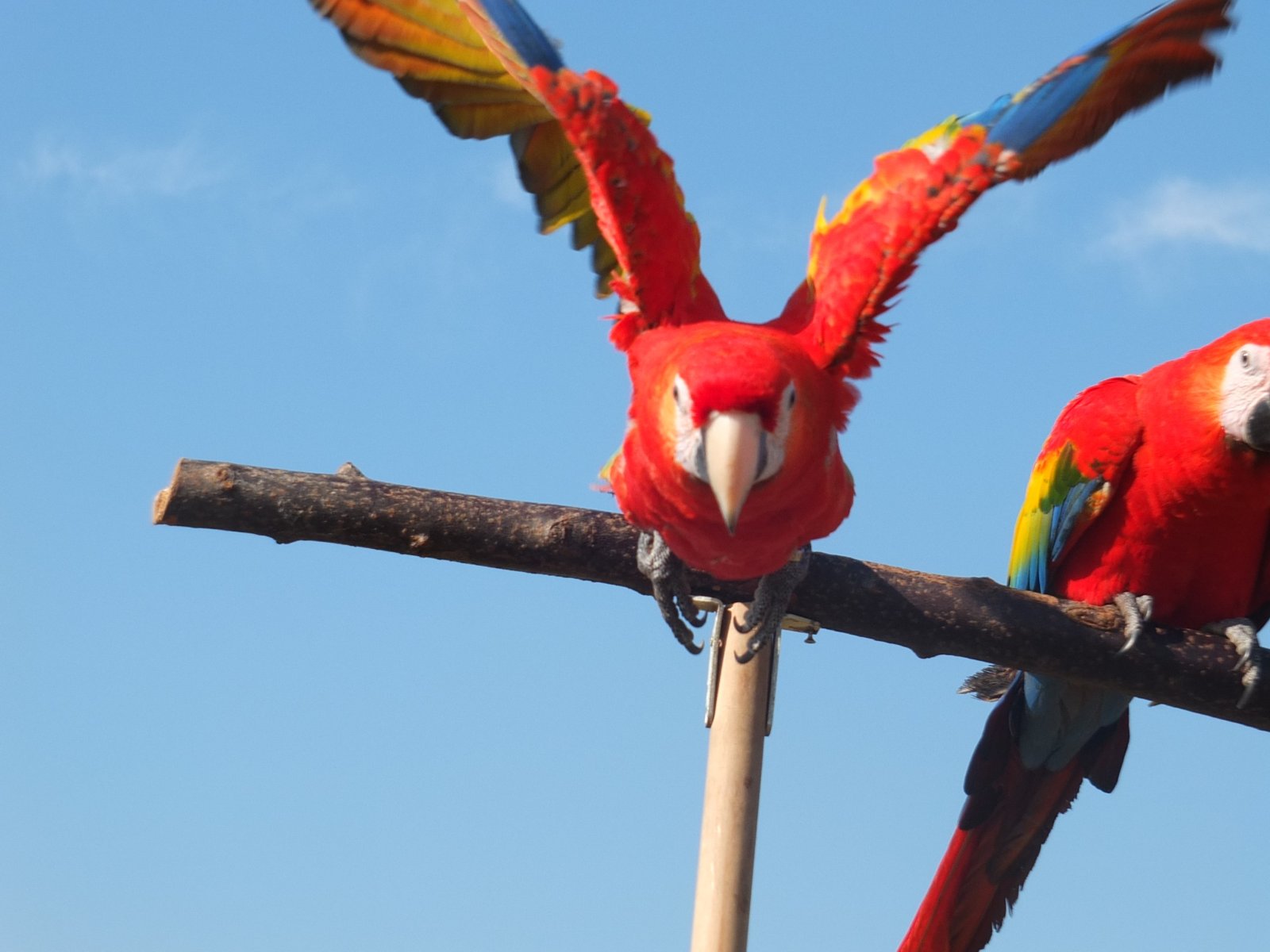Zdeněk mi také pomohl sehnat samičku Goldie, samečka Diega mi pomohl pro změnu sehnat Petr Augustýn z Faunaparku v Lipové, kde také létá na volno sestřička Diega jménem Zoey. V první fázi tréninku, ve kterém mi nejvíce pomáhal a radil Přemek John, dostávali arové večer trošku kaše na chuť v injekční stříkačce. Tu dostali a pak „zaparkovali“ k miskám, aby si dali plnohodnotnou večeři. Šlo to výborně, oba si pro kašičku zprvu chodili pěšky. Když už měli sílu v křidélkách, tak si i přilétli, či zkoušeli sletět z menší výšky. Jakmile začali pomalu odmítat kaši a plnohodnotně zobali pevnou stravu, přešli jsme na odměnu v podobně kanadských borůvek. To už jsme také začali pomalu chodit ven na kšírech, aby se papoušci začali seznamovat se světem venku. Se zvuky aut, venkovním ptactvem a se vším, s čím by se mohli potkat při pobytu na volno tak, aby je v budoucnu překvapilo co nejméně situací. Začalo přivolávání z bidélka na ruku a z ruky na bidélko na velmi krátké vzdálenosti, které se posléze zvětšovaly.