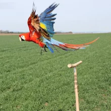 Když toto zvládali téměř na 100 %, začali jsme hledat krytou halu, abychom mohli sundat kšíry a trénovat bez nich. Nejvíce se osvědčila hala pro jezdecké koně, která je ideální pro trénink papoušků z mnoha důvodů. Minimální rozptýlení pozornosti papouška, který nemá moc možností přistání, kromě bidélka nebo trénující osoby. V neposlední řadě se také nemusí řešit úklid. To už byli papoušci ve fázi, kdy ztráceli zájem o odměny v podobě borůvek, a tak jsme hledali, co jim nejvíce chutná z oříšků. Přišli jsme na to, že to jsou pinie, které se dodnes u nás používají jako odměny. Odměna by měla být malá, aby zabralo co nejméně času ji sníst, ale zároveň i chutná, aby papouška motivovala provádět další a další cviky (v této fázi tréninku zejména přílety).