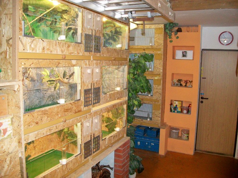 Z mého pohledu jsou také skvělé tzv. ptačí pokoje. Jde o místnost v bytě nebo domě, kterou chovatel obětuje pro chov exotů. V takovém pokoji můžeme umístit klece, voliéry i vitríny, nebo zařídit pokoj jako jednu velkou voliéru. Jediné, co bude ptákům chybět, je vyhřívání na sluníčku. Pokud ale v místnosti budeme ke svícení používat kompaktní žárovku Arcadia Bird Lamp Compact, která byla vyvinuta proto, abychom mohli poskytnout ptákům chovaným v zajetí optimální náhradní zdroj UV záření, nebrání nic v tom, si takovou chovnou místnost pořídit.