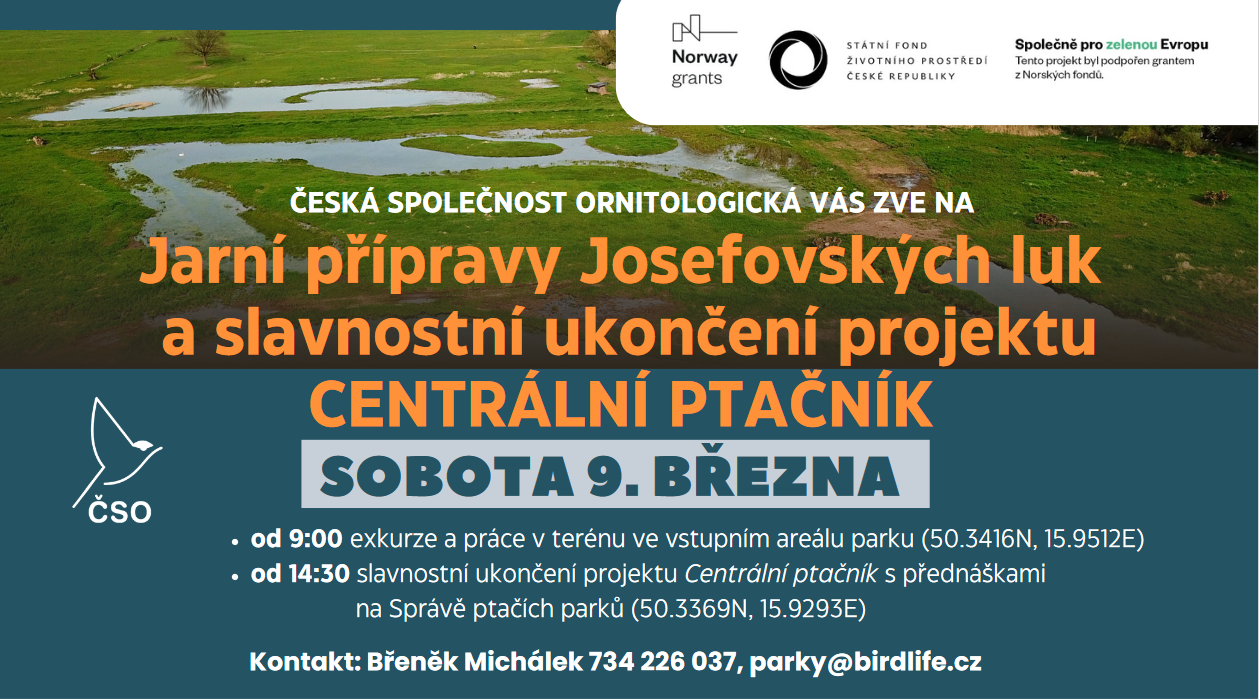 Více zajímavostí ze stále pestřejšího ptačího parku Josefovské louky se dozvíte z přednášek a filmů na slavnostním ukončení projektu Centrální ptačník a okrajové tůně na Josefovských loukách, které proběhne 9. 3. 2024 od 14:30 na Správě ptačích parků ČSO v Okružní 36 v Josefově. Předcházet bude ranní dobrovolnická brigáda přímo v parku spojená s exkurzí a prohlídkou nových tůní. Více na birdlife.cz/josefovske-louky/akce-v-parku/.