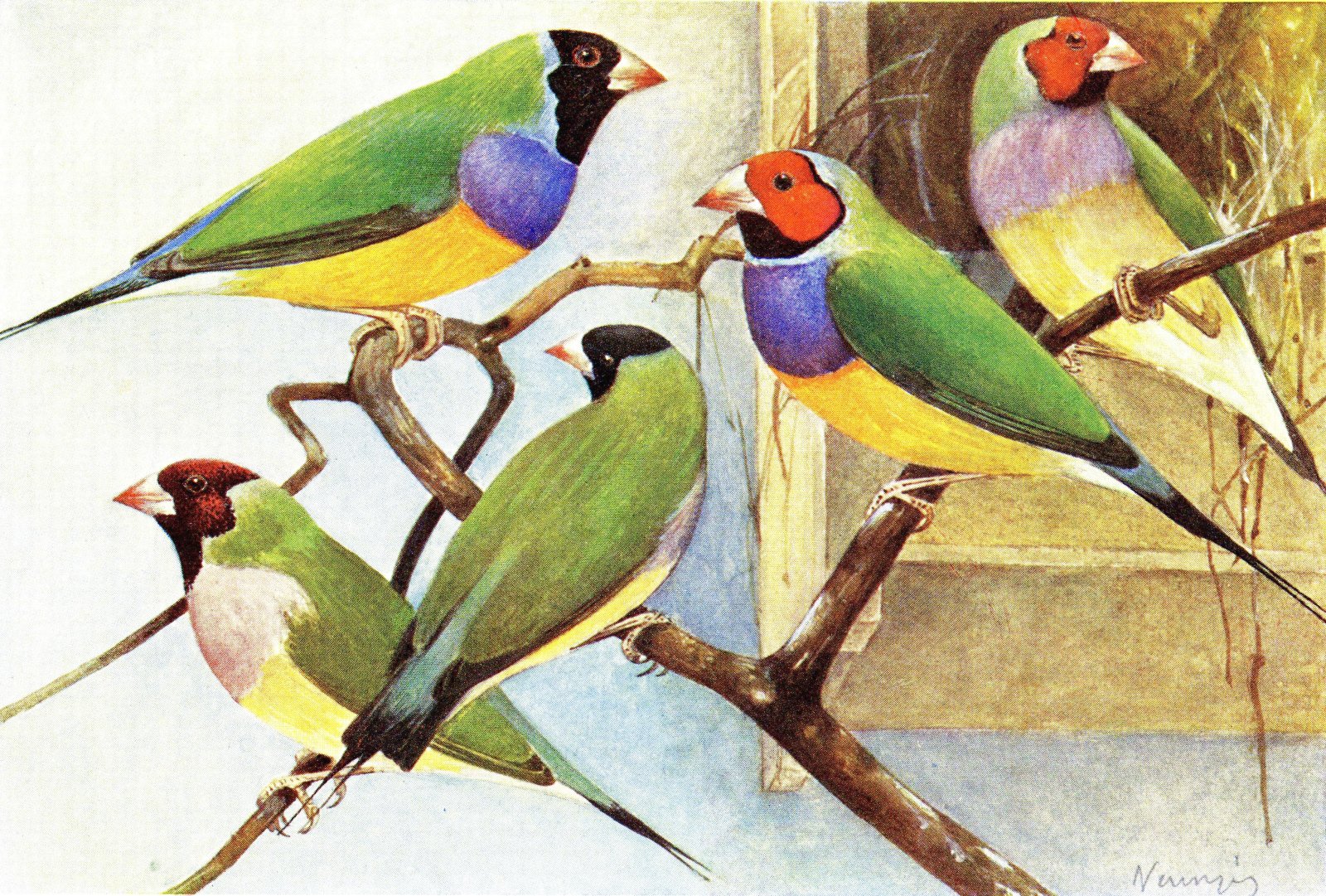 Amada Gouldové černohlavá - tři různé samice v období po hnízdění