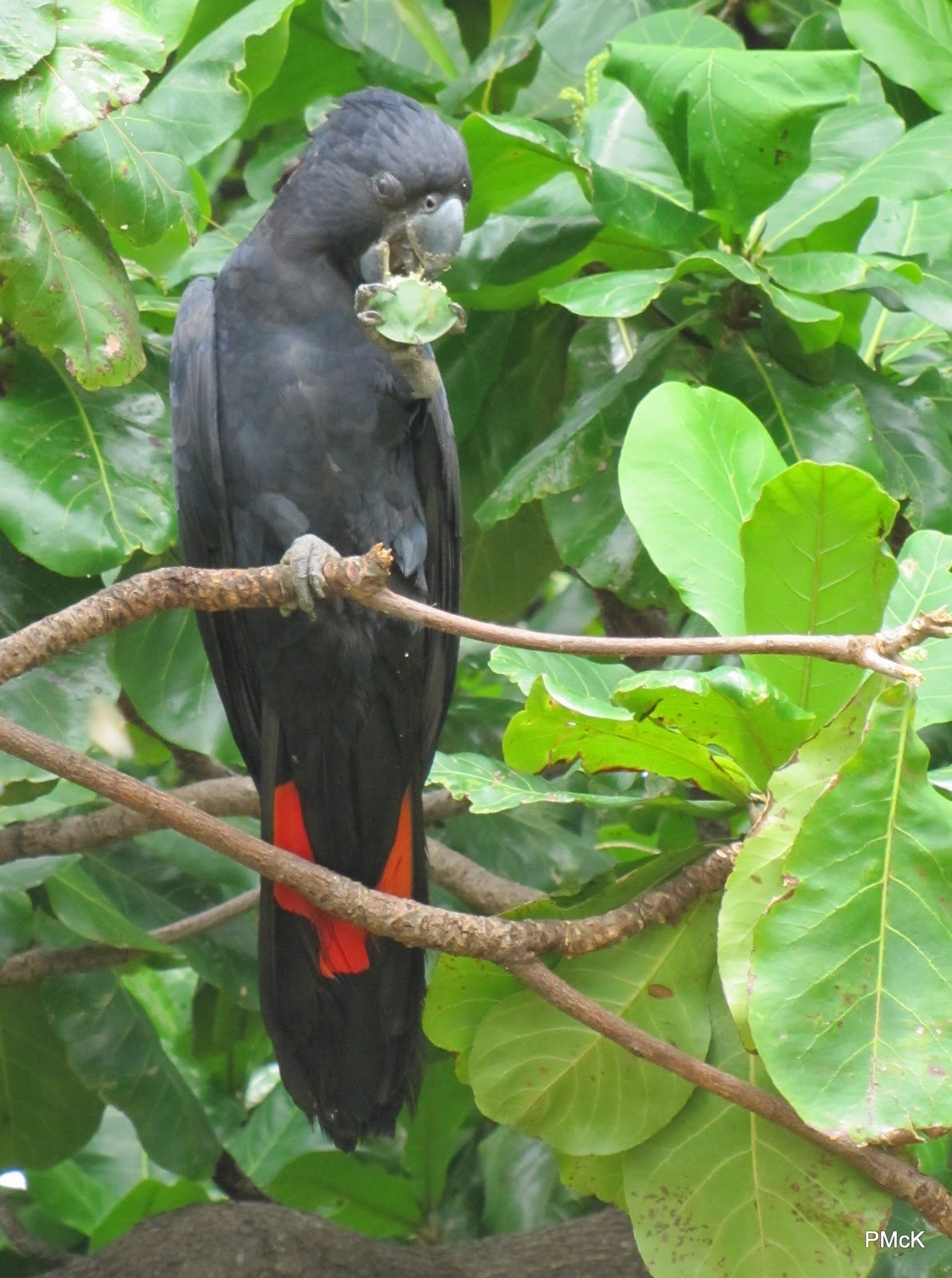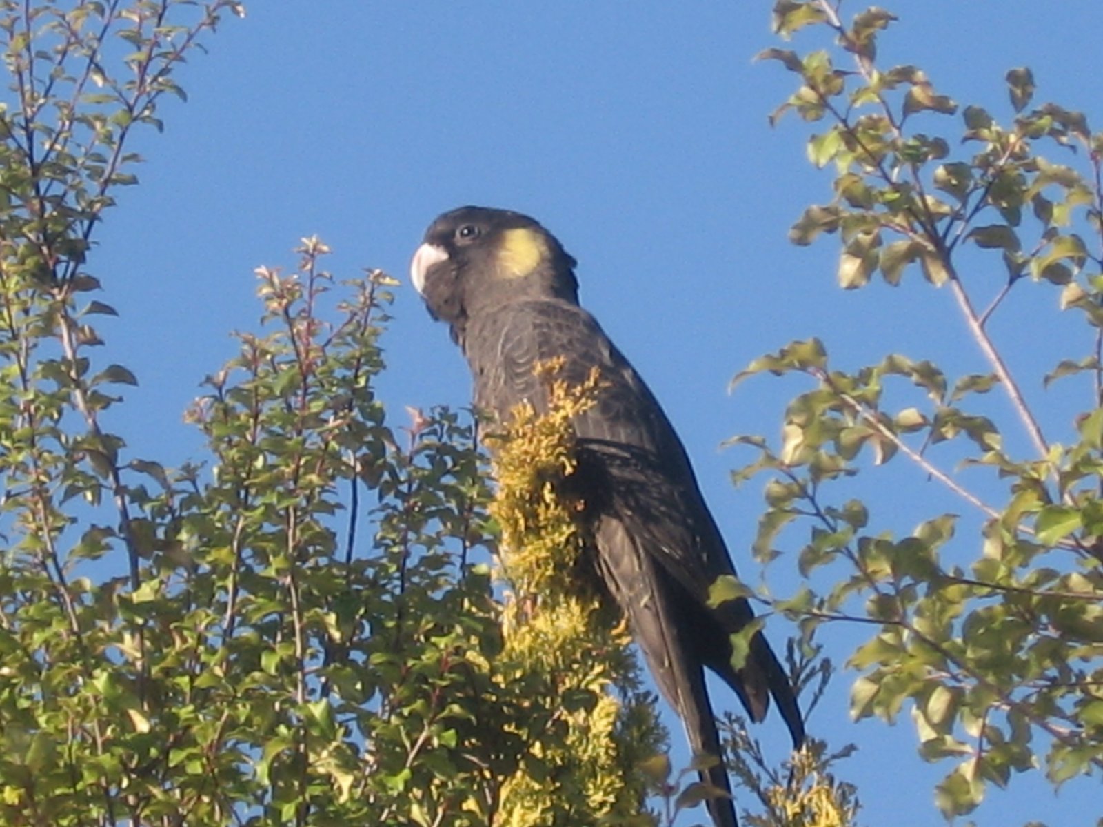 Pod odlesněnými kopci, na kterých se pásly ovce, bylo rozlehlé venkovské sídlo a v jeho středu se tyčil asi třicetimetrový rozsochatý blahovičník, plný ideálních hnízdních možností pro papoušky. O jeden z těchto otvorů se prali hned tři samci kakadu černého, zatímco jediná samice na jejich počínání pohlížela s ledovým klidem. Samci měli nápadně rudé okruží očí a za letu krásně patrné žluté znaky v ocase.