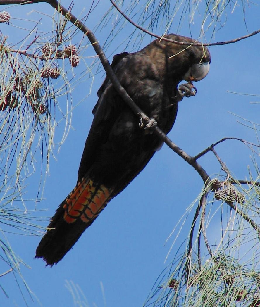 Na Klokaní ostrov jsme se ale mimo jiné vydali za jedním ze vzácných a ohrožených druhů papoušků – kakadu hnědohlavým, resp. jeho jižní formou (Calyptorhynchus lathami halmaturinus). Je o něco menší než kakadu černý a hlavním poznávacím znakem jsou červené znaky v ocase, kterými se ovšem chlubí také o dost větší druh - kakadu havraní (Calyptorhynchus banksii). Ten je daleko větší (až 65 cm), jednotvárně zbarvený a bez žlutého límce u samic.