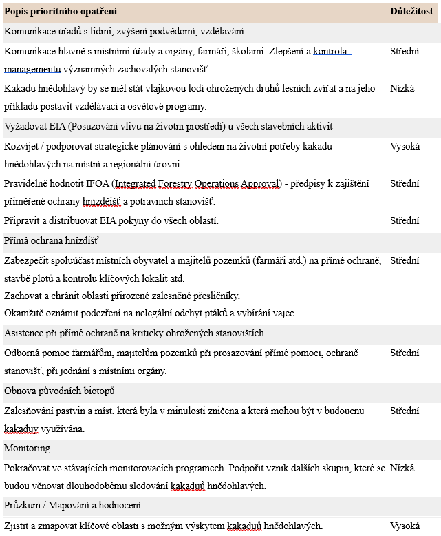 Orgány ochrany přírody se pochopitelně snaží nejen omezovat negativní vlivy na snižování početnosti kakaduů, ale podnikají i řadu konkrétních kroků k jejich záchraně. Odbor životního prostředí a ochrany Nového Jižního Walesu (The Department of Environment and Conservation of New South Wales) určil několik prioritních kroků k obnovení populací kakadu hnědohlavých. Ukazuje je následující tabulka: