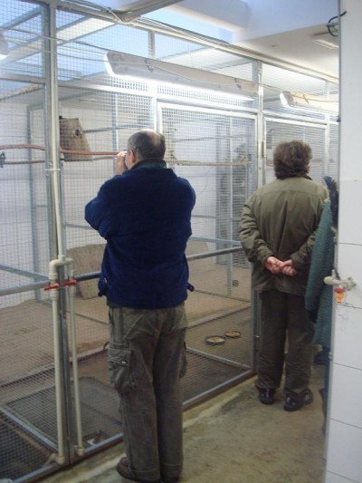 Druhý den po probuzení jsem spěchal do salónku, jelikož měla přijít přednáška inženýra Čiháka o chovu ptáků ve velkých společných expozicích Zoo Dvůr Králové. Zde bych se poprvé zastavil a uvedl pár poznatků. První věcí, které se věnoval byl typ oddělení ptáků od návštěvníků. V menší hale ptačího světa se totiž rozhodli k tomuto účelu použít ocelová „lanka" místo klasického pletiva. Přínosem je samozřejmě mnohem menší vizuální nápadnost těchto lanek, ale nevýhodou je to, že se někteří ptáci naučili mezi lanky prolétávat, a pohybují se tak volně po hale. Prvotní obava o to, aby se ptáci o lanka nepořezali byla zcela zbytečná. Jako nevýhodu takto velkých hal, či skleníků uvádí především nekontrolovatelnost volně umístěných ptáků. Další věci, kterou v tomto paviloně řešili byl způsob oddělení průchodu mezi oběma halami. Jako první vyzkoušeli oddělení pomocí provazů. Tento způsob se neosvědčíl, ptáci se naučili mezi provazy chodit, a docházelo tak k agesivitě mezi chovanci jednotlivých hal. Podobně neúspěšný byl také pokus s použitím plastových řetízků. Posledním a nejlepším typem, který používají dodnes, jsou foliové pruhy, které se 5cm překrývají. Dalším problémem velkých voliér je manipulace s ptáky. Zde ho řeší třemi způsoby. První je odchyt pomocí ornitologických sítí, druhý pomocí sklopných klecí, a poslední pomocí velkých uzavíratelných klecí, do kterých je ptákům během roku podávána potrava, aby se naučili do klece běžně chodit. Tyto klece jsou také používány na vypouštění nových jedinců do voliér. V halách je krmení všem ptákům volně dostupné, což může být problém v době odchovu některých ptáků, kdy silnější ptáci sežerou většinu hmyzu, a menší druhy pak například nemají dostatek hmyzu na krmení mláďat. Odčervování není prováděno pravidelně, vícéméně podle potřeby do vody. Aby zajistili vypití vody s léčivem, umísťují ji těsně vedle misky s krmením. Specifickým problémem je odchyt myšáků, který je řešen pletivovým válcem s několika vchody, do nějž dávají ovoce jako lákadlo.