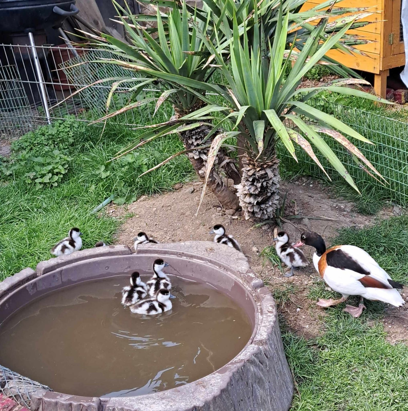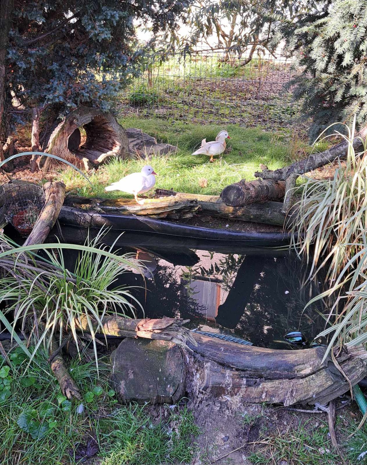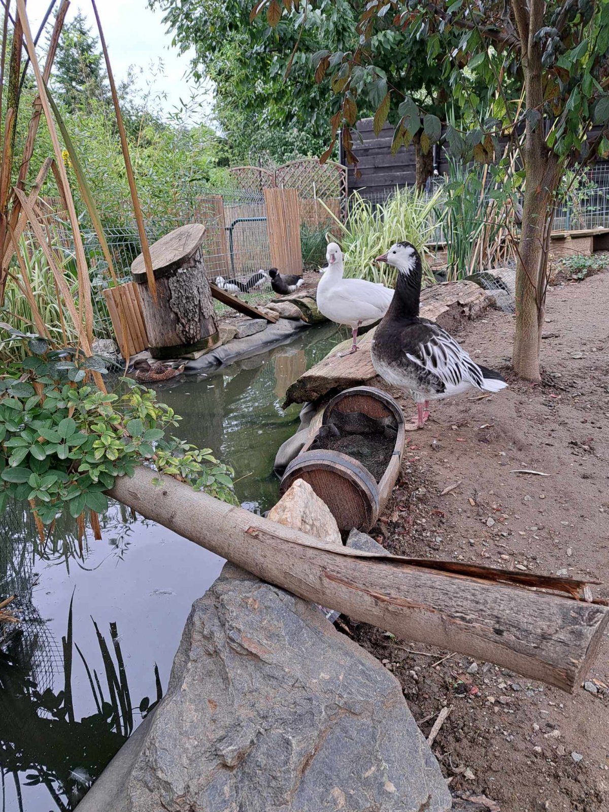 Pak paní Danu odvedly domů na chvíli neodkladné povinnosti. Já jsem se prošel zahradou, výběhy a jezírka téměř všude, bujná vegetace v nádržích, která jsou někdy zapuštěná, někdy vyvýšená, mají zdrsnělé části břehů umožňující zvířatům dobrý vstup na vodu i výstup na břeh. Rostliny a kusy starého dřeva na březích zdařile napodobují přírodní zákoutí. U velké nádrže vytvořila chovatelka z velké klády něco jako přírodní molo nad vodou, kačenami evidentně zamilované. Uvědomil jsem si, že nebude snadné, aby se vše vešlo do jedné rozsahem omezené reportáže a napadlo mne, jak těžké bude vybrat fotky.