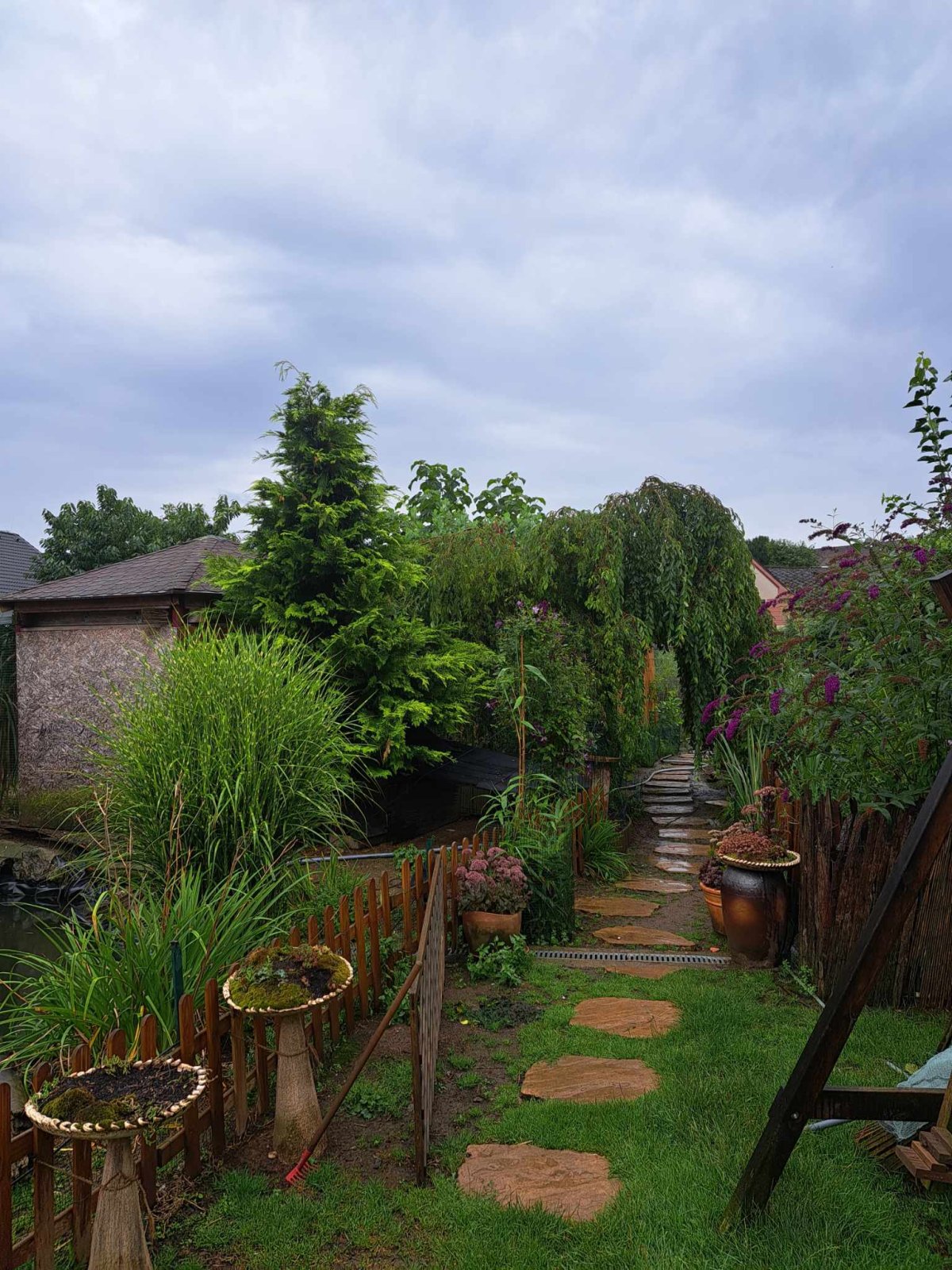 Nejprve jsem před sebou uviděl cestičku z nášlapných kamenů vedoucích mezi vzrostlé stromy a keře a záhy zaslechl zvuk tekoucí vody. Paní Dana si toho všimla: