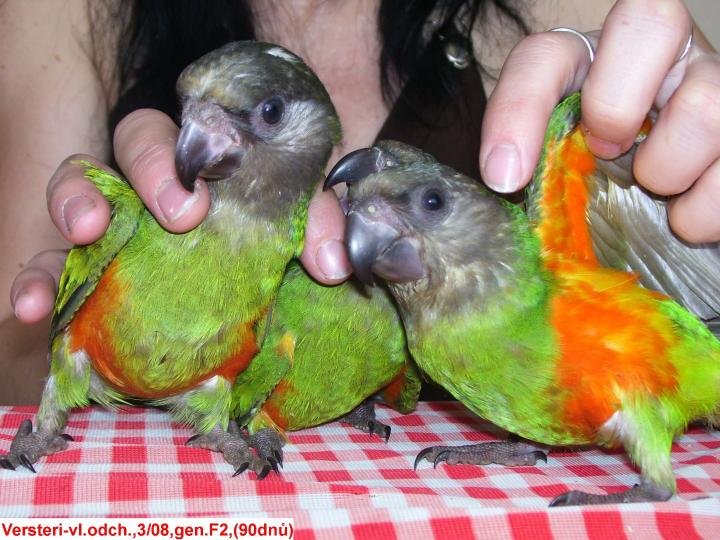 Jak se vlastně odlišují od oranžovobřichých (Mezotypus)? Tak tuto otázku jsem často slýchával nejčastěji, a to nejen od laiků nebo začátečníků, ale i od zkušených chovatelů. Myslím, že je to dost smutná skutečnost. První pár papouška senegalského Versteri jsem si koupil v roce 2000 z importu Plzeň. Bylo mi řečeno, že je to první dovoz do ČR?! No nebyla to pravda, ale odchovy se nepovedli. Byli a jsou to krásní ptáci a za rok nasedli a odchovali 3 mláďata (2,1). Měl jsem 4páry versteri a z toho tři páry chovné a za pár let bylo 10párů chovných a zajímavé bylo, že jednu sezónu nasednou jedenkrát ročně a druhou dvakrát, a tak se to střídalo. Perfektně sedí a starají se o potomstvo na 100 %. Snůšky čítají 3–4 vejce, a co vejce to mládě. V tomhle směru jsou bez problémů. Já si ani nemůžu na žádný problém s nimi stěžovat. Mají své nároky, ale který druh je nemá.