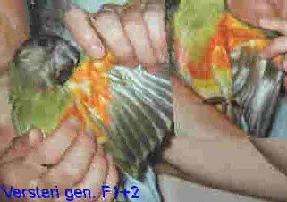 Takže důležitý a zásadní rozlišovací znak u formy versteri je červená barva pod křídlem, sytě červená prsa a mají tmavě zelenou a hlavu šedočernou! Nejlepší je porovnat mláďata versteri a mezotypus, ale... již na první pohled je rozdíl znát a je jasný. Ten, kdo tohle nerozezná, tak má buď potíže s očima nebo to rozeznat nechce. Lidská závist tu jistě hraje svoji roli. Mnozí chovatelé tuto vlastnost jistě zažili, stejně jako já, na vlastní kůži. Někteří chovatelé popisují, že forma mezotypus 0,1 je pod ocasem také zelená, ale já jsem měl 0,1 u této formy pod ocasem žluté – sice matnější se zelenými pírkami, ale žluté. U versteri musí být 0,1 pod ocasem jenom zelená a je přepojena až se zeleným klínem na prsou a nesmí chybět červená barva pod křídlem! Jistě není žádným tajemstvím, že čas od času se objevují senegalci žluté straky a také skořicoví – podle mých zkušeností se nejedná o žádnou novou mutaci, neboť se zatím nikomu nepovedlo tyto zvláštnosti ustálit v genech. Navíc jsem zjistil, že všechna vajíčka od žluté straky i od skořicové jsou čistá. Byly měněny samice, použil jsem i vlastní chovné, bohužel výsledek se opakoval – ani jeden zárodek… Doufám, že někdo jiný bude mít víc štěstí, sám bych si to moc přál, protože jsou to moc krásní ptáci.