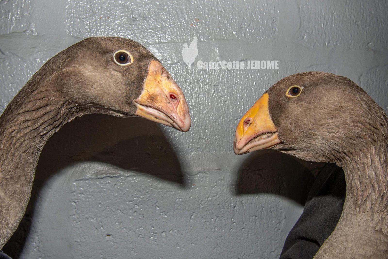 Detail hlav bojových hus křivozobých (vlevo husa, vpravo houser).