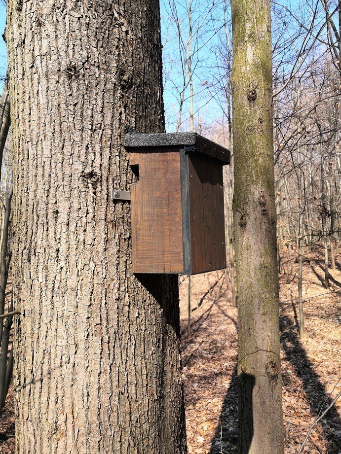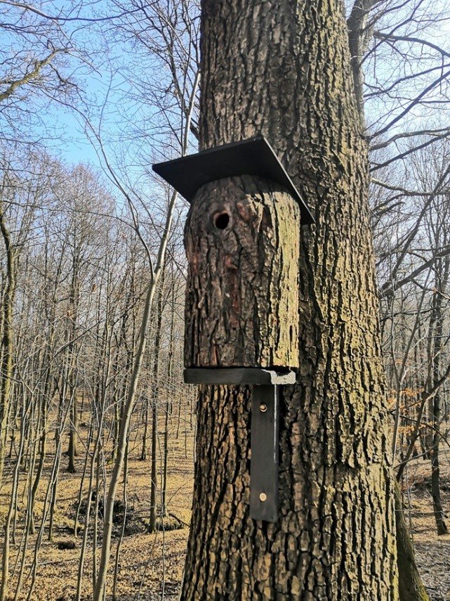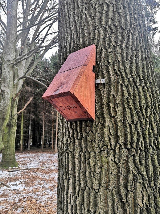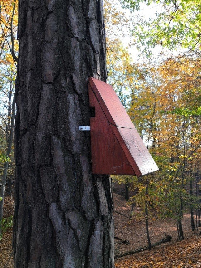- Prostorná budka se dvěma štěrbinovými otvory, kotvená přímo na kmen stromu.