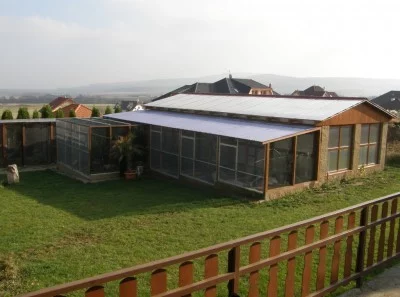 Vybudované zařízení je z části dřevostavbou, vyzděno je jen několik pilířů a severní stěna záletu. Velkou měrou je na stavbě využit čtyř komorový polykarbonát, který je vsazen do dřevěných rámů, které jsou osazeny v nosné konstrukci stavby. Střecha a strop záletů je z téhož materiálu, což bezesporu přispívá ke skvělému prosvětlení celého chovatelského zařízení, které je určeno mimo jiné i pro chov tukanů a arassariů.