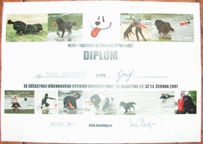Po dvou letech jsme udělali ve Vídni zkoušku na úrovni IRO RHWA, na což jsme vzhledem ke zdravotnímu stavu hrdý, a záchranářskou vodní část jsme měli za plný počet bodů. Na suchu to bylo horší, Grif je vodní pes a udělali jsme ji tak-tak, přece jen je německý ovčák rychlejší. Diplom ja na konci článku.