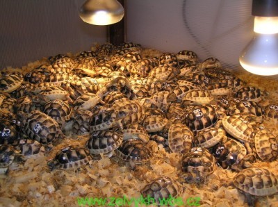 K vytápění terárií se občas doporučují různé topné kameny, rohože a podobné speciality, pro želvy jsou ale naprosto nevhodné. Příliš vysušují substrát, pokud jsou zapnuté neustále, tak zabraňují nutnému poklesu nočních teplot. Želva je přizpůsobena k tomu, přijímat teplo ze slunce, tj. zhora. Stačí proto umožnit želvě vyhřát se například pod reflektorovou žárovkou, Pokud nechcete, aby se vám v terárku bimbal nemotorný květináč, je dobré použít " Reflektorovou žárovku SPOT R 80" Je to padesátikorunová záležitost, mají jí v každém větším elektru a plně uspokojí požadavky vaší želvy. Kolika watová má být, záleží na podmínkách kde se terárko nachází. Já používám 40-60W a je to tak akorát. Na substrátu přímo v kuželu světla by měla být teplota 35-40°C, želva ale musí mít možnost se v opačném rohu terárka v případě potřeby ochladit na 20-30°C. Pokud je terárium umístěno na opravdu světlém a teplém místě, není třeba svítit žárovkou celý den, stačí např. tři hodiny ráno, tři odpoledne.