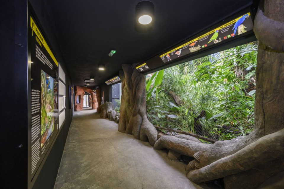 Různá intenzita osvětlení a simulace deště společně s pravým rostlinstvem vyvolává pocit přirozeného papouščího biotopu. Posuvná střešní okna navíc dávají papouškům možnost přirozeného slunečního svitu a deště. Ojedinělá stavba stojí na místě, na kterém byli papoušci pražské ZOO vystavováni návštěvníkům již od jejího založení v roce 1931. Možná proto celý pavilon zapadl do úpatí strmého svahu, jako by zde stál odjakživa.