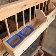 Samotný box je tvořen klasickým dvoj-budníkem (tři boxy mají budníky z drátěného programu z kuchyňské skříně) a sedačkou. Vše je rozebiratelné a vyndavací. Lávka je z jedné strany nasunuta na dva vruty, na druhé vložena na dvě skobičky. Čílka budníků jsou uchycena na kuchyňské magnety. Na dno pokládám naformátované kartony a na ně pak rošty. Na hnízda si vyrábím dřevěné rámečky, do kterých vložím kobercovou vložku, dospod ořechové listí, navrch slámu. Pro lepší přístup a čistění (příp. vypouštění) dělám u boxů dvoje dvířka. V hlavních je rovnou zabudované žbrdlení, které je součástí krmítka vně budníku. To je tvořeno dřevěným rámečkem zavěšeným na skobičkách. Do něj vkládám závěsné misky. Nad krmivem je dřevěná přepážka, zabraňující vyhazování zrní. Pod dvířky je vyklápěcí lišta, zabraňující vypadávaní podestýlky při otevření. U každého budníku jsou tři skobičky na kroužky - svazové a značkovací.