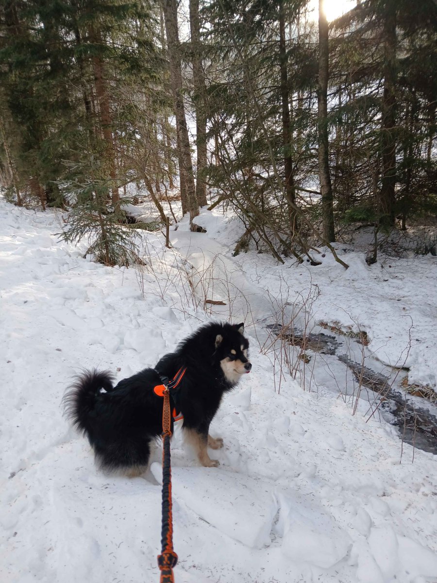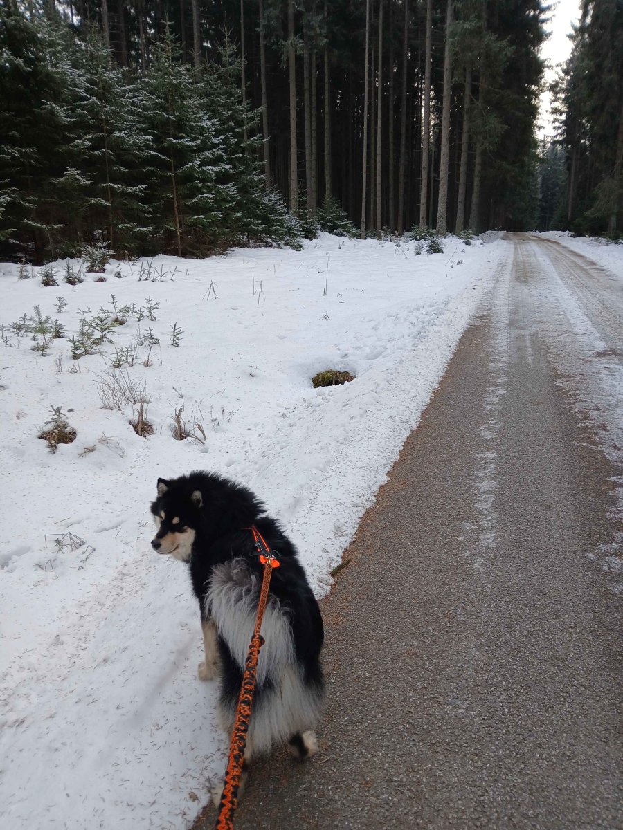 Tam, kde se dá dobře jít jsou povrchy, kde je jasný, že byla použita sůl…takže silnice a některé chodníky, kde je teda suchej asfalt…odhrabaný sníh kolem těchto ploch jsou defakto ledový střepy na umrzlých hromadách…tam kde se dalo docela v pohodě chodit po ušlapaném sněhu, tak je ledovka a zbytek sníh s ledovou krustou, kam se člověk boří…a teda pes taky.