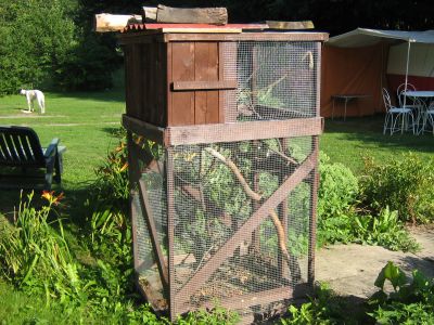 Peťula22.07.2010, 22:36:42xxx.xxx.6.82Tak jak jsem slíbila, dokončená volierka pro šplhavé aymarky, rozměry jen 1m x 1m x 1,8m. Dřevěný materiál co dům dal :-), cena 300 za pletivo, panty, zavírání, šrouby, hřebíky do 100,- Kč. Myslím, že jsou spokojené :-)