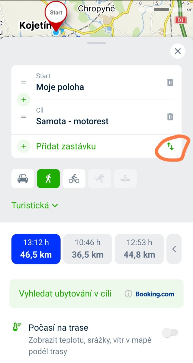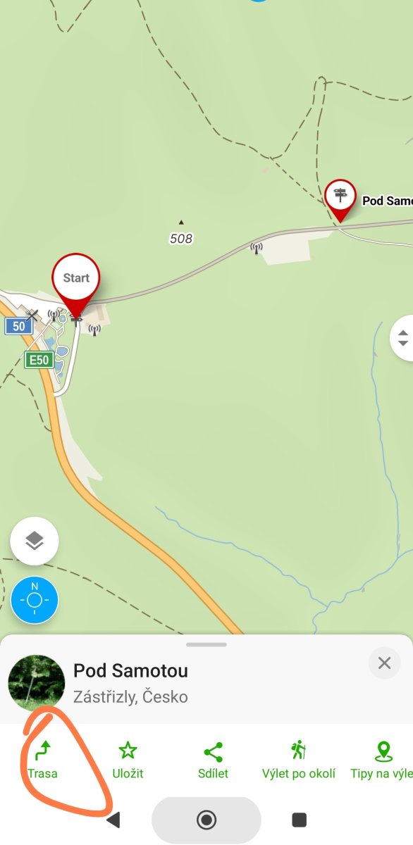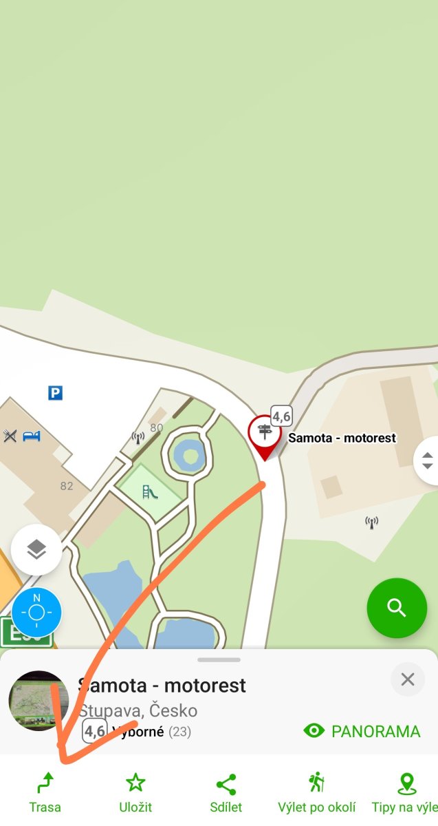 9. Když nemám rozcestník, tak si podržím v mapě prst, udělá to bod, dám “trasa” a už jedu. 😀