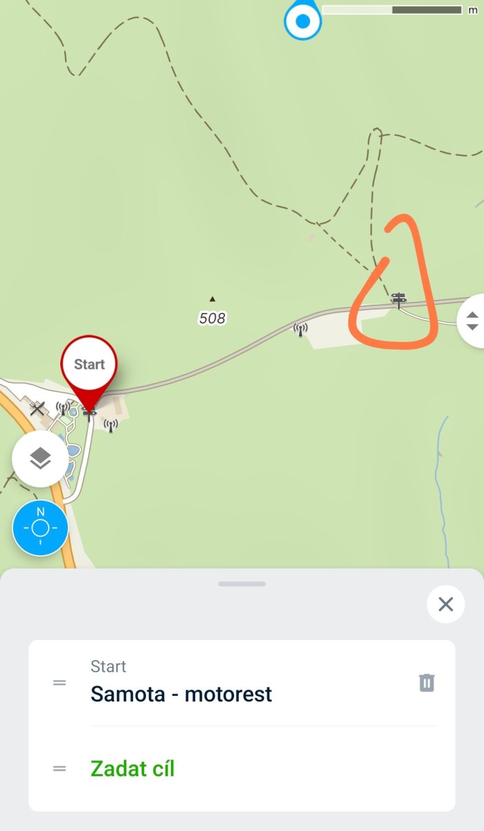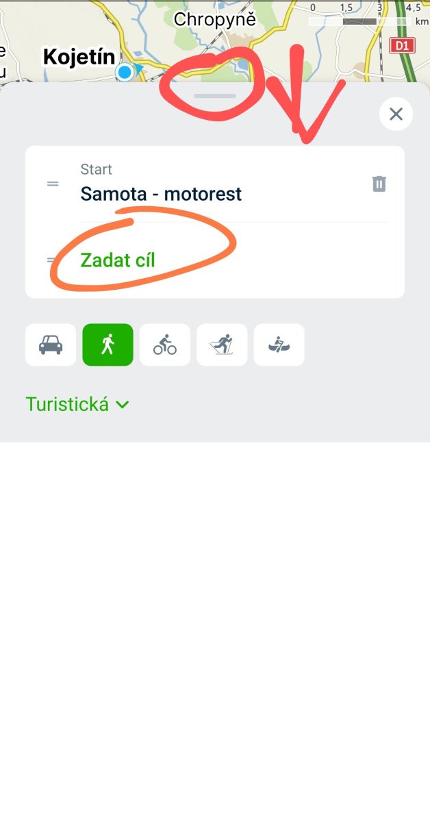 5. Dám zadat cíl. A potáhnu si mapu dolů. Roztáhnu si mapu tak, abych se dostala na výchozí místo.