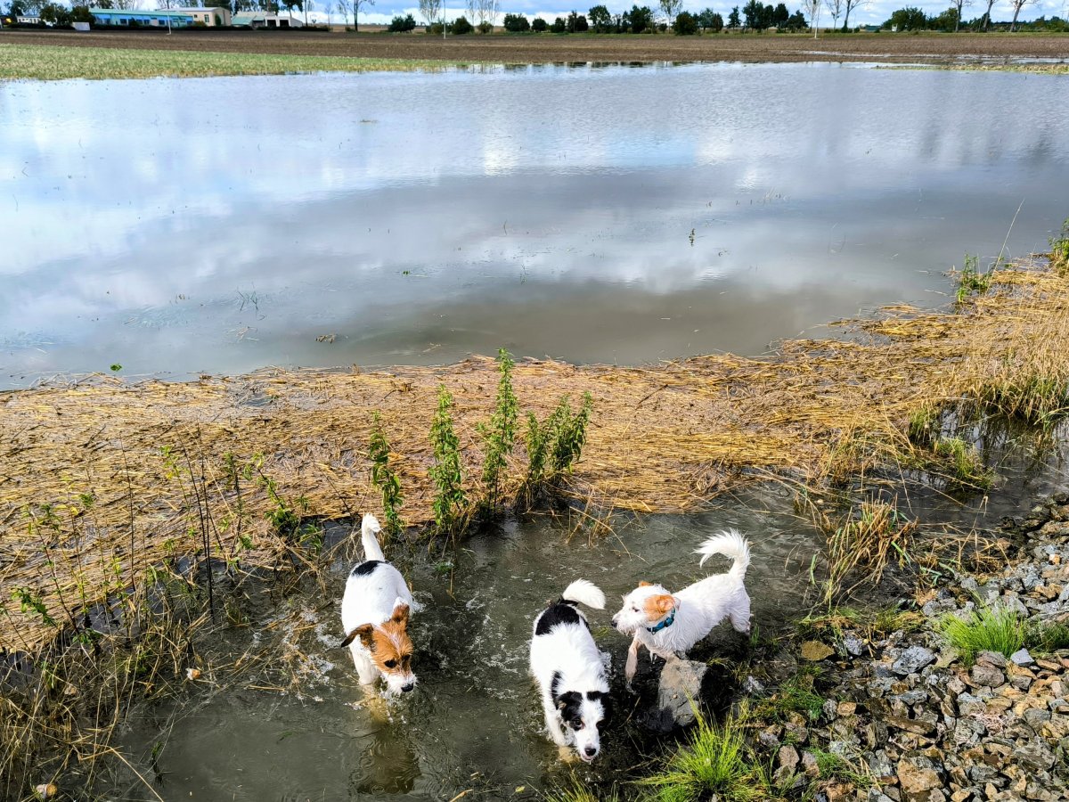 U nás chvíli vylezlo sluníčko, tak jsem vzala spratečky okouknout vodu za barákem. Aspoň někdo má z té vody užitek. 😂
