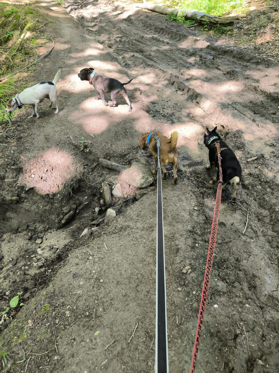 Cesta tam byla krutá, protože jsem vybrala tu nejkratší a nejhorší a kdybych neřídila, blila bych už po pěti kilometrech. 😂 Po prvních dvaceti kilometrech jsem se úplně nejvíc nasrala, když mi došlo, že sedák leží doma na skříni. 🙄 Naštěstí mám v tašce s psíma cajkama ještě opasek a tak jsem se nemusela vracet. Ovšem vzápětí jsem se nasrala hned po druhý, páč jsem si uvědomila, že v té tašce není ani jedno vodítko, krom těch dvou na tahání. 🤧 Nu což, vracet se nebudem. Nebude to poprvé, co půjdeme na výlet bez vodítek. 🤐