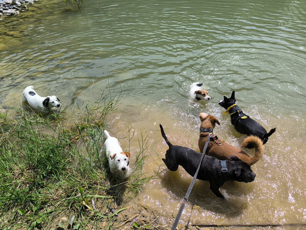 Asi mi tím chtěl vykompenzovat hororovej zážitek z prvního dne, kdy jsem ho poprvé v životě pustila na volno a on vzadu v kempu na louce vyšlápl kočku na sebevražedné misi. 🤐 Kočky teda jako totální magoři končily velice často na stromech, na plotech a nebo v okapech na střeše, ale nakonec ty teriéry přežily všechny. 😂