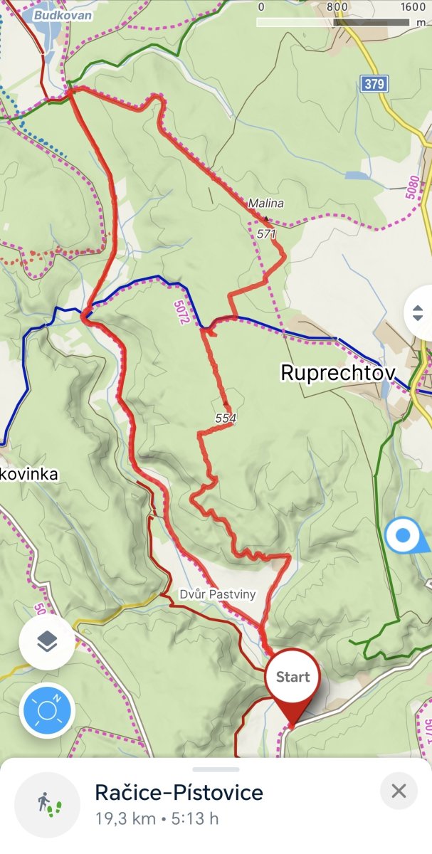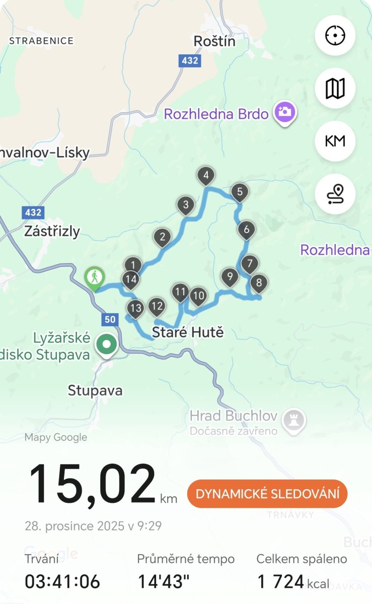 Včera klasika start u Motorestu Samota, šup nahoru k Vlčáku, kolem něj zase dolů k Buchlovským kamenům, kde jsme si dali sváču, poté dolů po žluté do Staré Hutě, za obecním úřadem nahoru do lesa a kolem Sněženkového kopce zase zpět na Samotu.