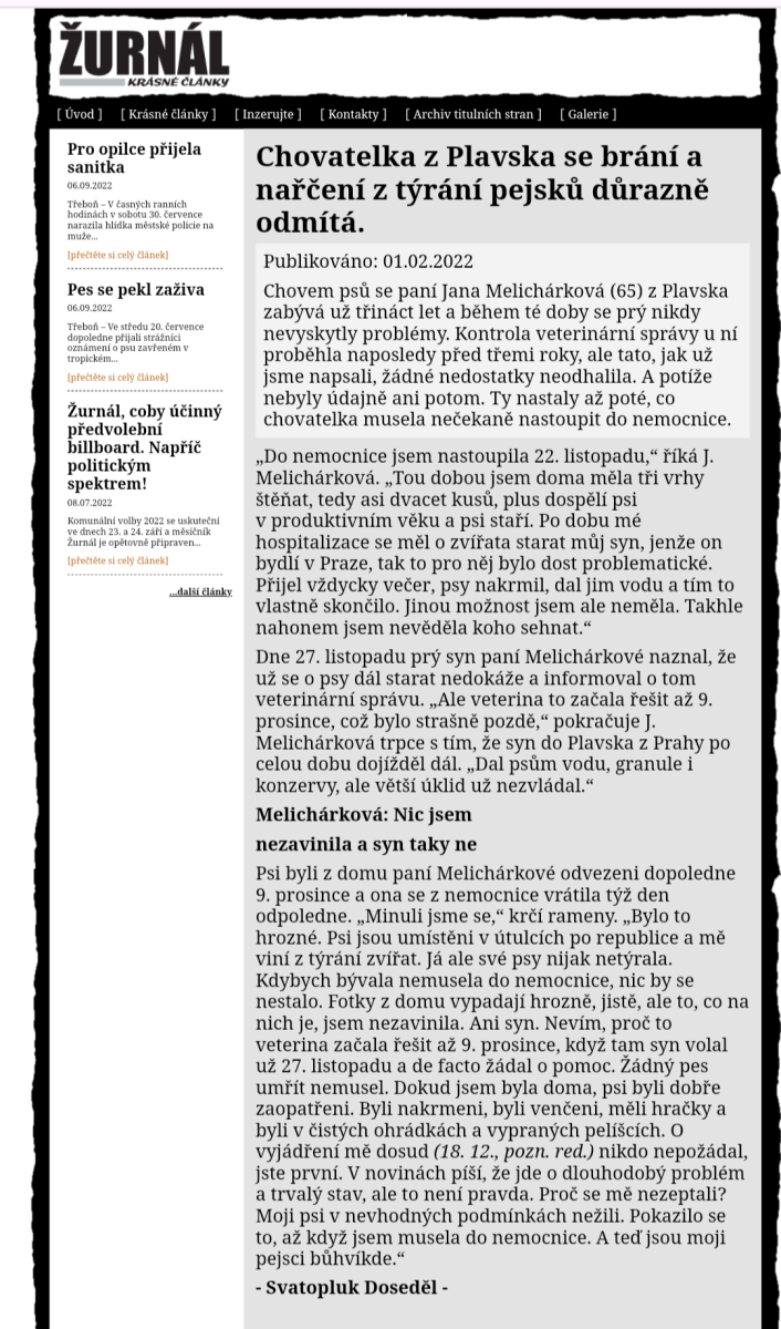 Po více než 2 letech skončila kauza Plavsko. Pouze 15 psů z téměř 50 se však dočkalo v útulcích propadnutí státu = byli chovatelce nadobro odebráni. 9.12.2021 jsme přivezli z Plavska zubožené a děsivě zanedbané jorkšírské teriéry. Celkem jich u nás našlo útočiště 14. Březí fence se u nás pak narodila ještě 2 štěňátka, bohužel 3 jorkšírci se nového domova nedočkali. 2 fenky podlehly svému zdravotnímu stavu a nebylo jim přes nejlepší veterinární péči pomoci, jednoho pejska srazilo auto, když se dobrovolníkovi lekl při venčení velké rány od dělobuchu a utekl mu. Po odvozu pejsků z Plavska se rozjel nekončící právní kolotoč ve kterém jedné straně šlo o blaho zvířat a snažila se tak o co nejrychlejší ukončení celé situace = propadnutí psů státu, ale straně druhé šlo bohužel o úplně jiné věci. Vše se táhlo a táhlo až se stalo, že spousta psů byla chovatelkou rozdána jejím známým a s největší pravděpodobností se jí tak vrátila oklikou zpět. A i kdyby se zpět k ní nevrátili, lepší osud je asi nepotkal. Ale to je jen moje spekulace, každý nechť si udělá názor na osud rozdaných pejsků sám. Závěrem chci říct, že z našeho útulku se chovatelce nevrátil žádný pes. Všechny až na 3, kteří teď propadli státu a budou nyní nabídnuti k adopci, jsme my jako rodina, naši dobrovolníci a přátelé za nemalý peníz od chovatelky vykoupili a dali jim domov, protože už jsme nedoufali v dobrý konec. A po více než 2 letech přátelství a péče o ty malé skřítečky, jsme vůbec nemohli pomyslet na možnost návratu pejsků chovatelce do Plavska k čemuž se jednu chvíli opravdu schylovalo.