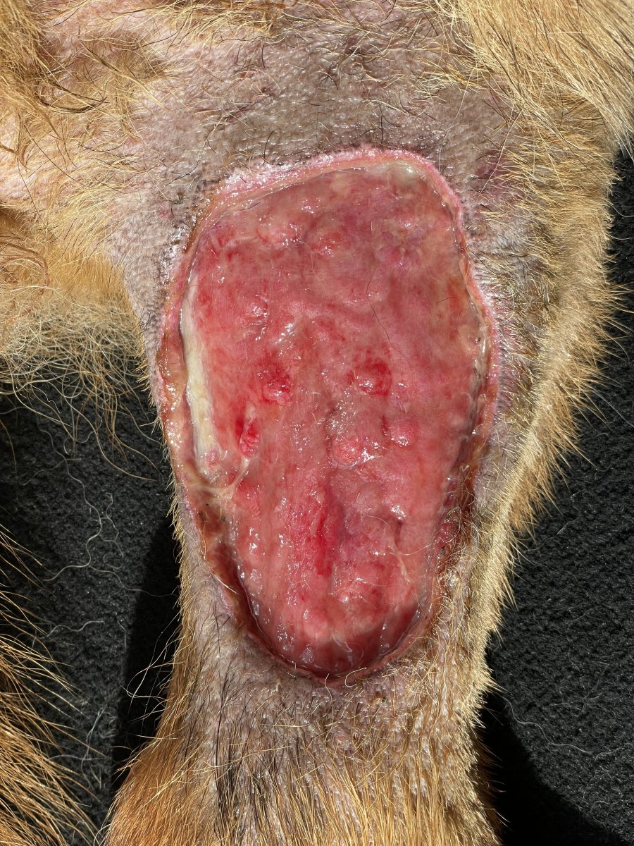 Jinak jeste fotka z dneska. Rana se mi osobne libi, jen ten levy kraj se zatim zatahuje pomaleji, tk uvidime, zda se to bude muset resit chirurgicky..