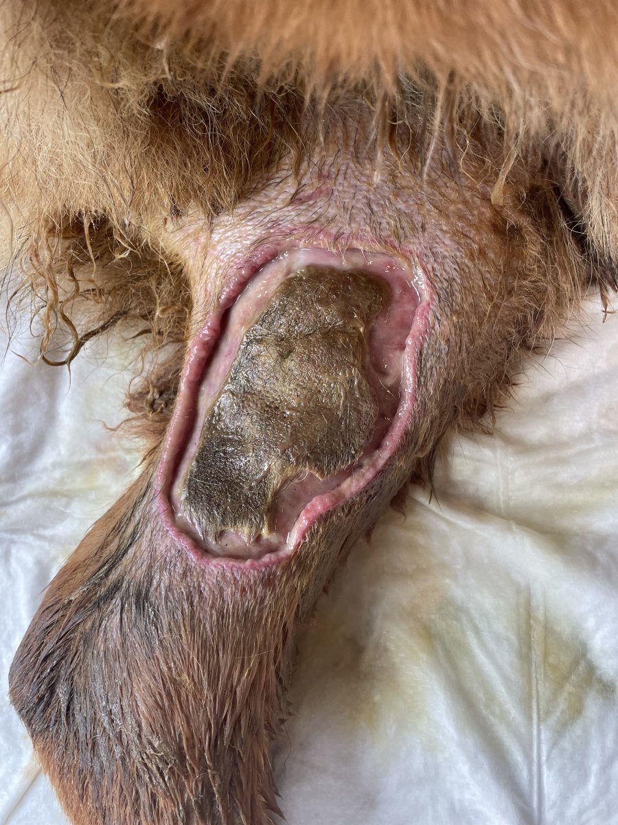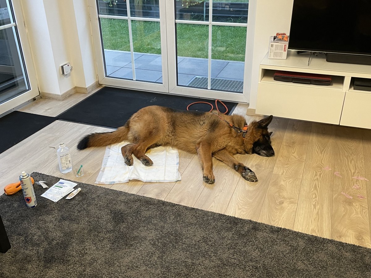 Jinak jsme pred chvilkou prijeli od veta domu. Rana se mu stale libi a Hachi mel prvni kuru laser terapie. Posilam vycistenou ranu.