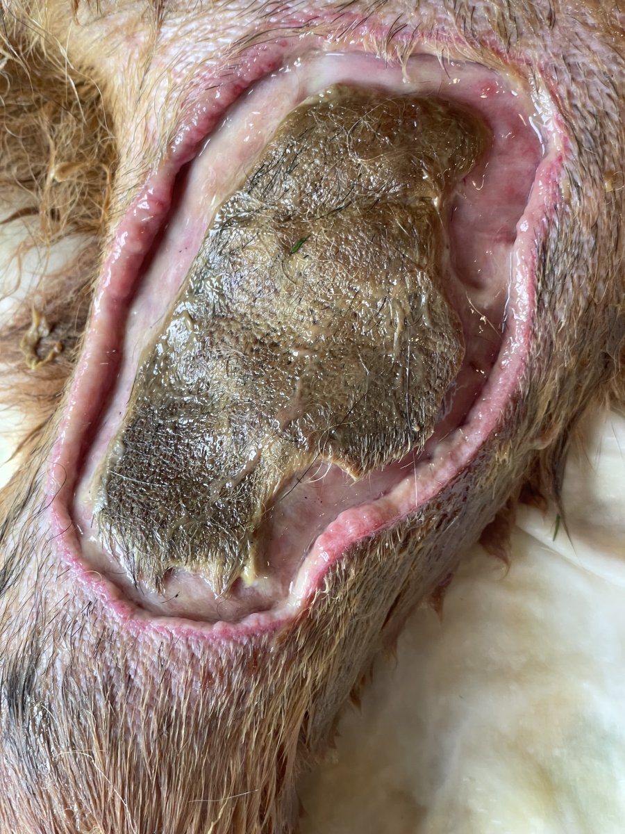Jinak pri cisteni jsem mu hnula nahore s tou nekrotickou vrstvou, takze pocitam, ze v nasledujicich dnech se zacne odlupovat. Pod ni je hezka ruzova tkan. Ta nekroticka vrstva ma podle me neco mezi pul a jednim cm.