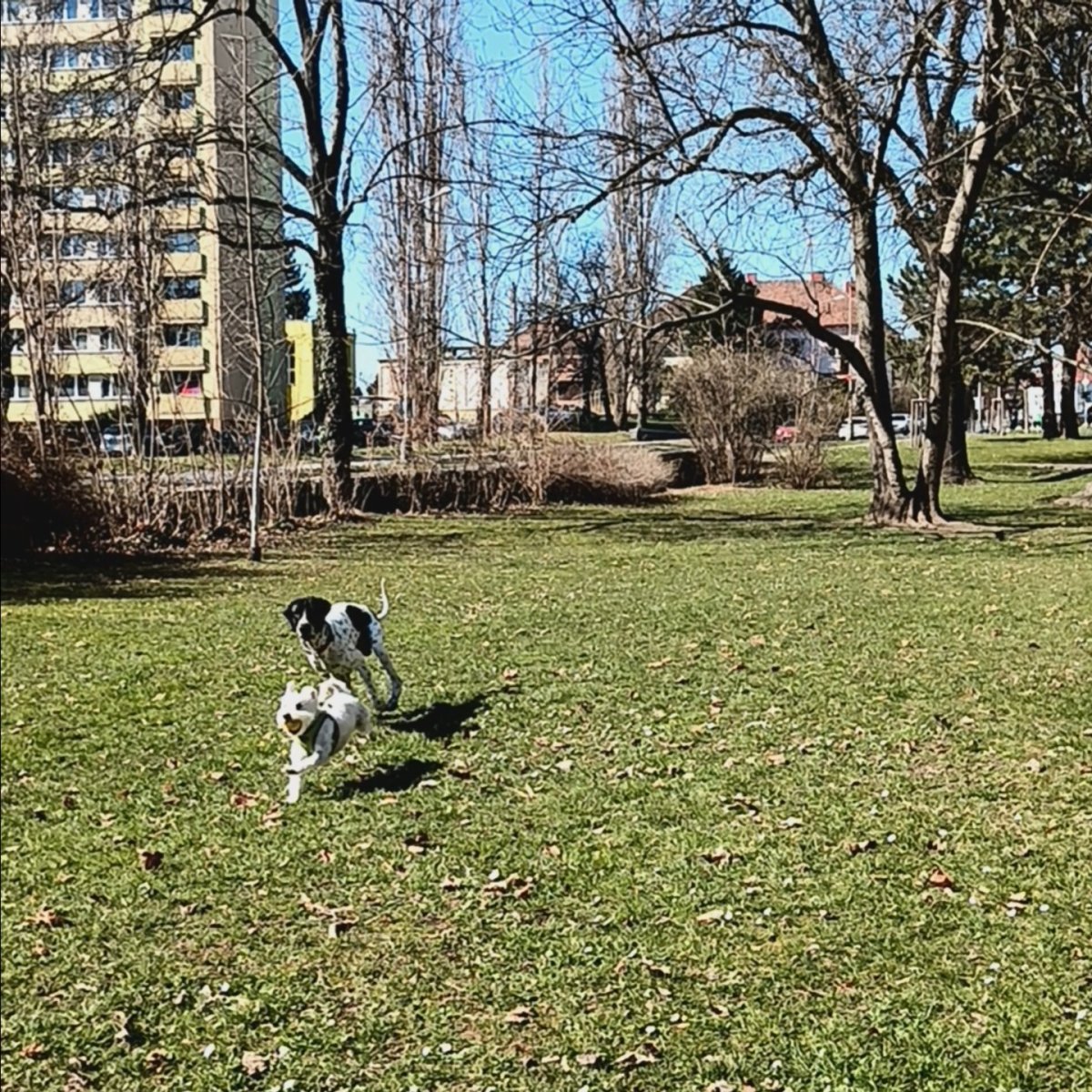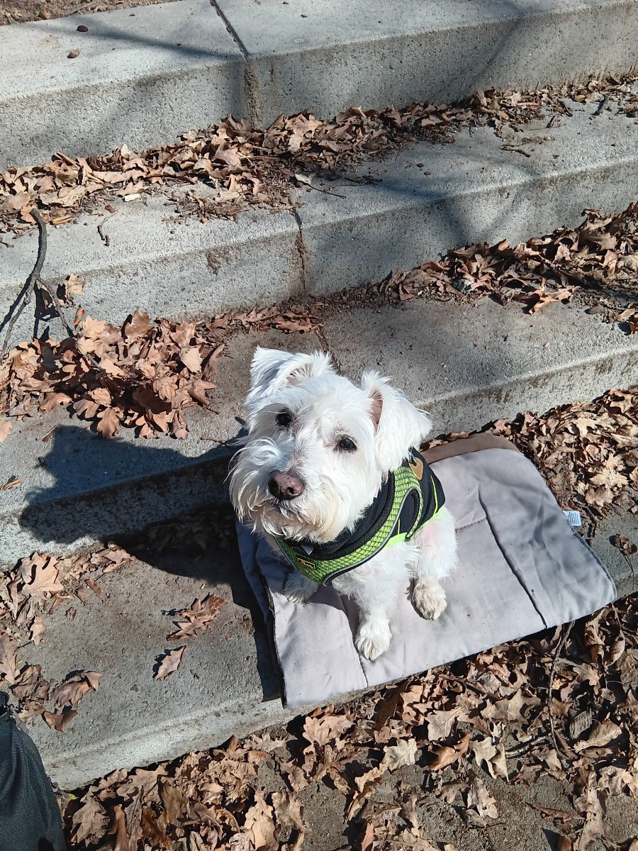 Zkusili jsme zánovní psí hřiště a bělouš má rád pochvalu, tak se předváděl, akorát už tu nikdo jiný nebyl, jenom panička. No chválila jsem, protože zvládnul všechno pro malé psy.❤️ Jsem ráda, že to nezapomněl. Na staré hřiště jsme dřív párkrát zašli 🐕 mají tu ten super patník na značkování a vzkazy 👍