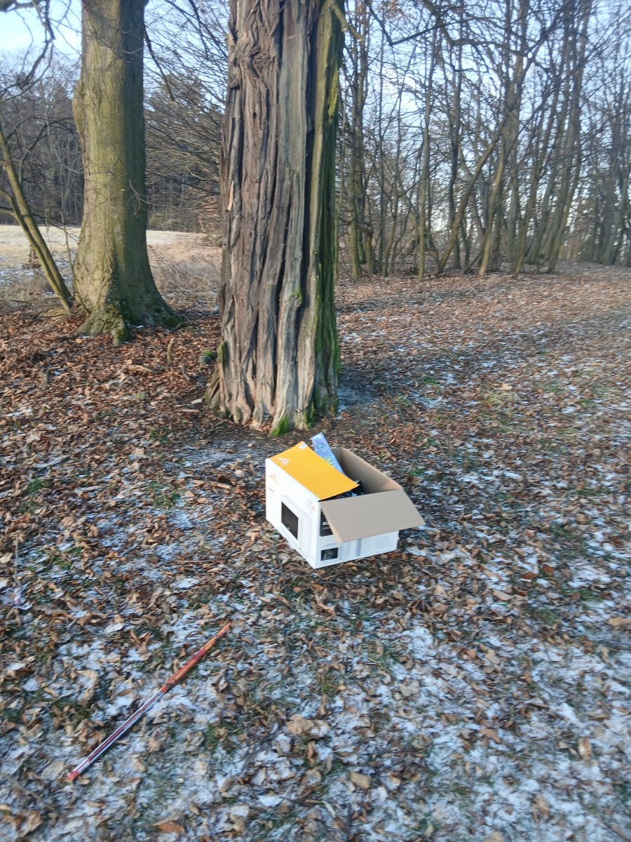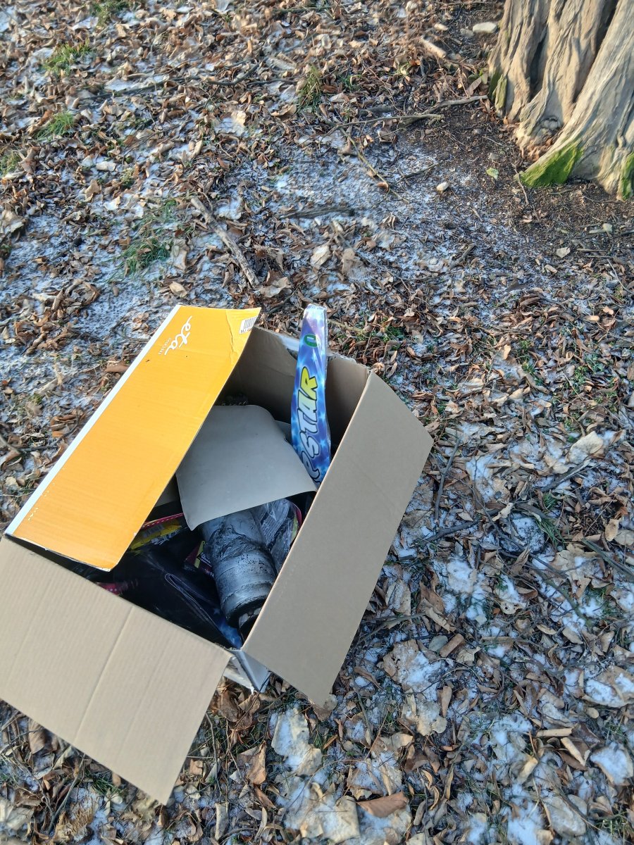 Nikoliv, v té krabici si to tam to hovado přineslo a nedokázalo to v ní odnést. Na venčení s sebou krabici nenosím, nosíváme s sebou pytel na sběr odpadků, které najdeme, s tímhle nikdo nepočítal.
