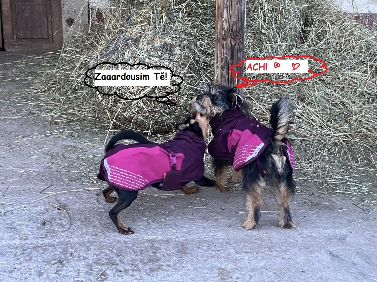 a to je pravda!! Náš kocour je takovej magor, že si s ním hraje jen naše nejodolnější ohařka, ostatní dva ohaři ač jsou značně větší než kocour, jeho styl hry fakt nedávají, protože je surovec. A leckdy zasáhnu i do bojů s ohařkou já, protože on to přehání a ona je hodná a trpělivá, kdyby chtěla, přepůlí ho, smrada drzýho, ale tiše trpí.