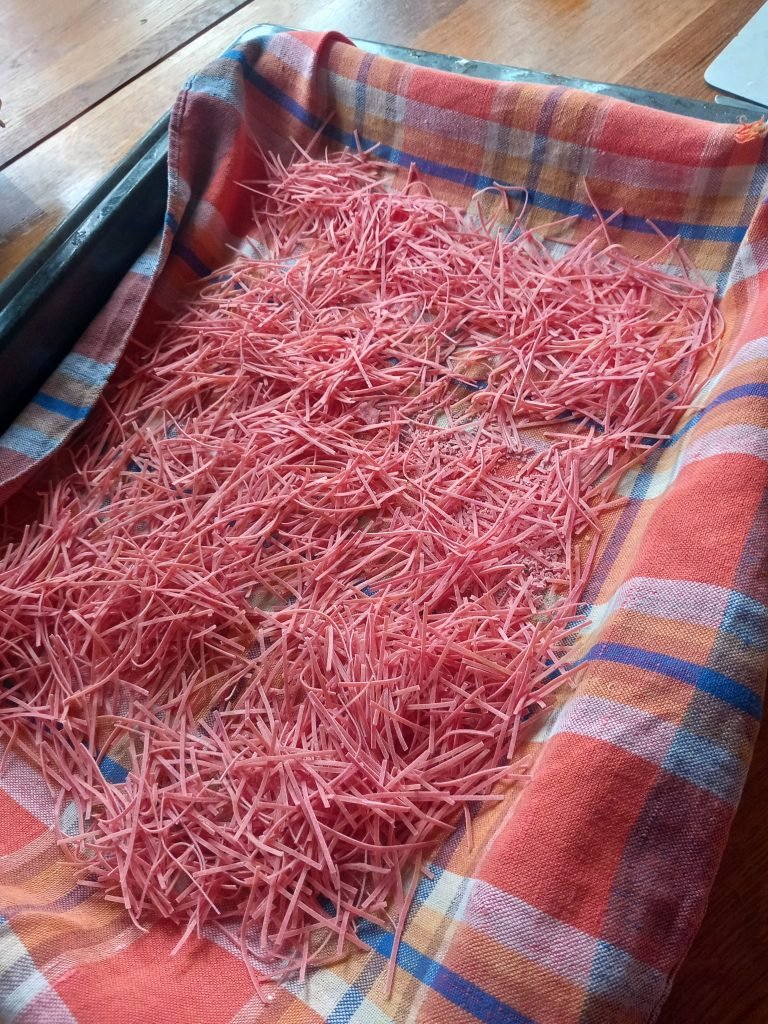 díkec, přišlo mi to zajímavý, jak je to žůžový. Bych ty svoje, co budu vyrábět mohla obohatit o sušenou řípu mletou, to by ptícám vadit nemělo a dosáhnu taky asi zajímavýho zbarvení.