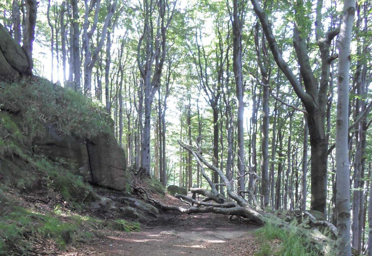 my dneska chodili u Efe za humny - zdolali vrchol Velké Bukové, obešli Malou Bukovou, koukli na Vavrouškův rybník (zarůstá rákosím a lekníny)… a chodili hlavně po cestách neznačených a nezpevněných. Moc hezky tam v bývalém ruském vojenském prostoru bylo. Pes je zcela mrtev, neboť byl plný elánu a krásně se vyblbnul v občas nejednoduchém terénu (sestup z Velké Bukové neměl chybu, tolik padlých bukových velikánů už jsem dlouho nepřelézala a cestička tam byla prošlapaná… a výhledy krásné)