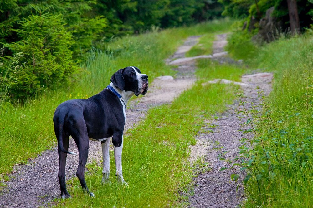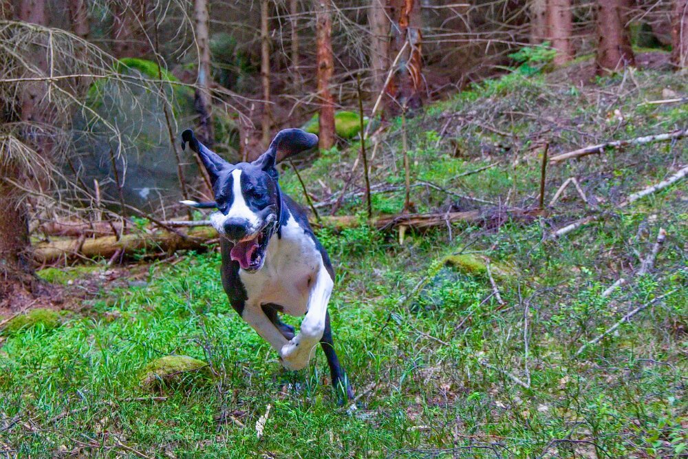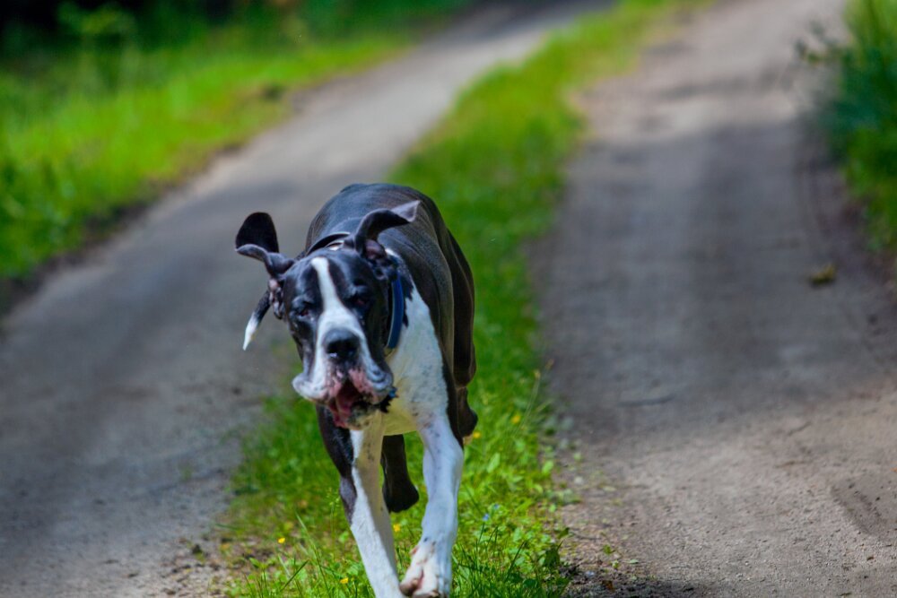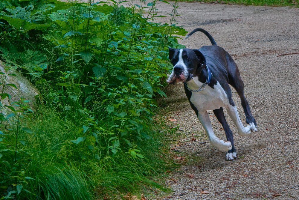 Yoda je má povolené vyhánět - ale ani jedna naše doga nebyla lovec - vyhnat ano, ale když kocour nestíhá být u plotu včas… doga zpomalí a udržuje stejný kočičí náskok. Do kontaktu nejde