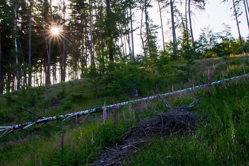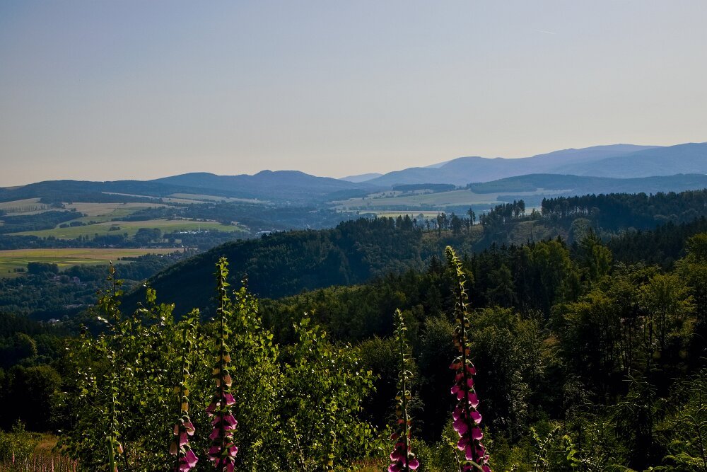 my brzy ráno vyběhli z Lučan na Bramberk (rozhledna ještě zavřená) - horské louky byly krásné a teplota byla ještě přívětivá. Spousta kytiček - ale i když je dohledáváme pomocí plantnetu, tak do hlavy ta nová jména nelezou. Samorostlík klasnatý si už pamatuju, ale zvonečník klasnatý jsme hledali dva dny po sobě… Neuložil se. Ale třeba kýchavice bílá je stará známá - ta je uložena od mládí a tudíž bezproblémová…