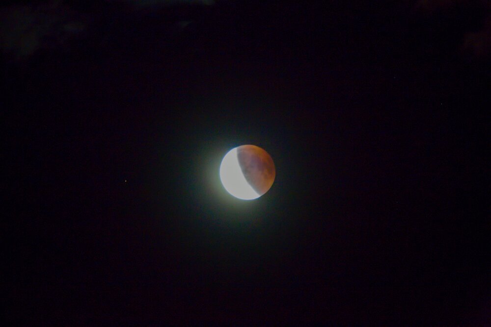 tak měsíc nejprve vzorně zatměný - ale brzy se na něj zasunul mrak a jak je bezvětří… tak měsíc vylezl až nyní… a to už je skoro po všem… Yoda naštván, že nechce být sám doma - ale na zahradě být taky nechce, neboť chce spinkat. Ale ne sám 😄 a to má dveře otevřené. Rozcapenec je to