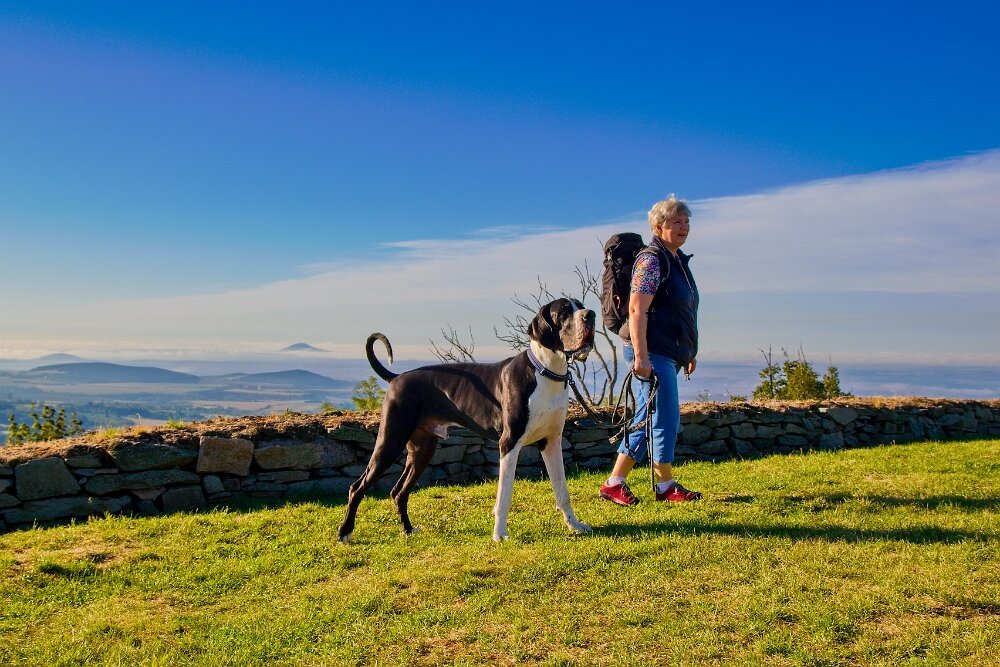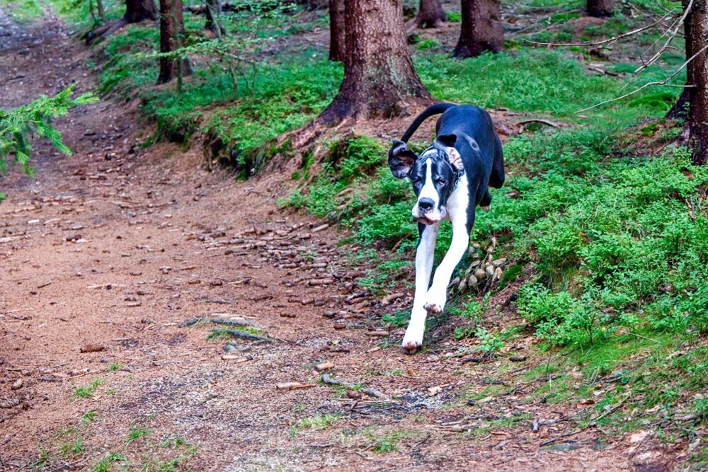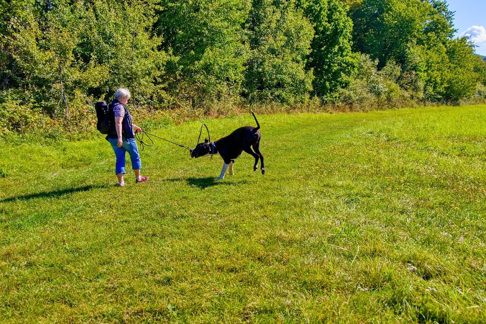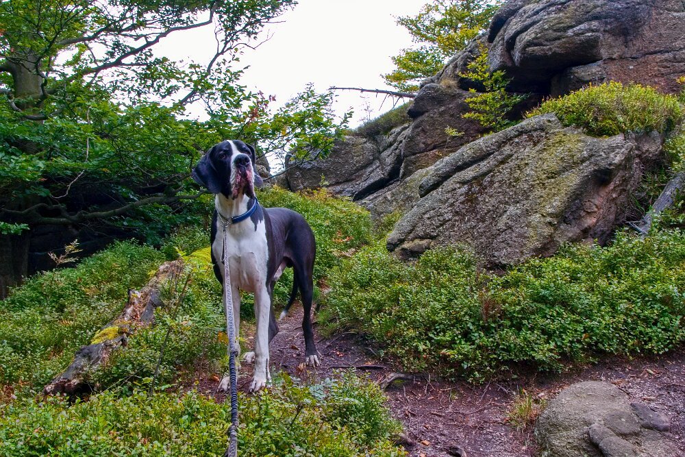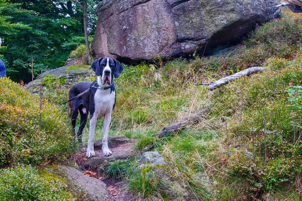 naše dogy jsou na hory zvyklé od malička… O tom problematickém úseku jsme věděli - a zatím jsme ho šli vždy obráceně - stoupání je pro dogy snadnější. Navíc si umí nechat pomoci - přizvednout pozadí, poskytnout oporu. Počítali jsme dneska s tím, že pokud Yoda zastávkuje, otočíme to a kus se vrátíme a půjdeme jinudy (nejsem zvědavá na to, aby chtěl využít ty stupy a zlámal si tam tlapu). Překvapil, jak suverénně vyrazil - vůbec nezaváhal. Tohle jsou terény, kde doga to má těžké - lehčí pes má výhodu.