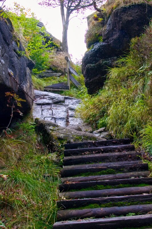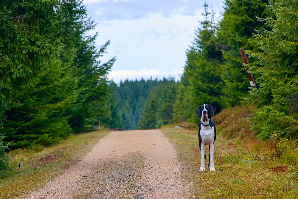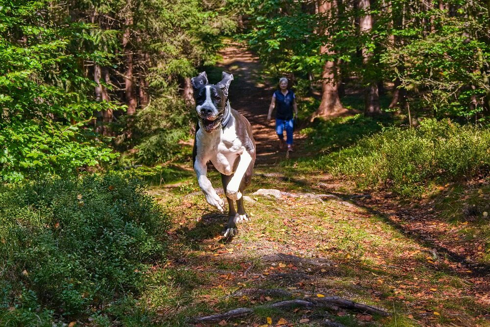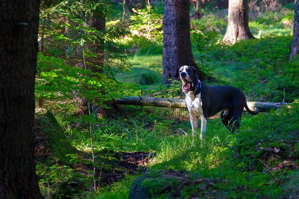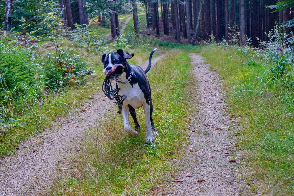 naše dogy jsou na hory zvyklé od malička… O tom problematickém úseku jsme věděli - a zatím jsme ho šli vždy obráceně - stoupání je pro dogy snadnější. Navíc si umí nechat pomoci - přizvednout pozadí, poskytnout oporu. Počítali jsme dneska s tím, že pokud Yoda zastávkuje, otočíme to a kus se vrátíme a půjdeme jinudy (nejsem zvědavá na to, aby chtěl využít ty stupy a zlámal si tam tlapu). Překvapil, jak suverénně vyrazil - vůbec nezaváhal. Tohle jsou terény, kde doga to má těžké - lehčí pes má výhodu.
