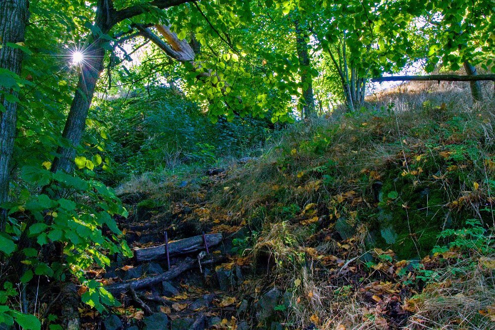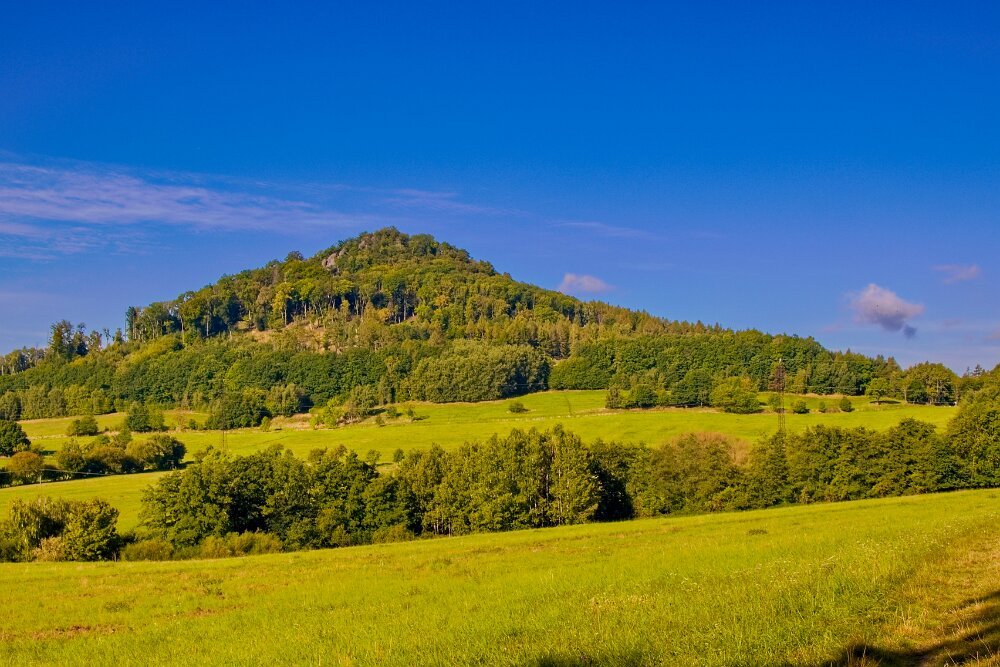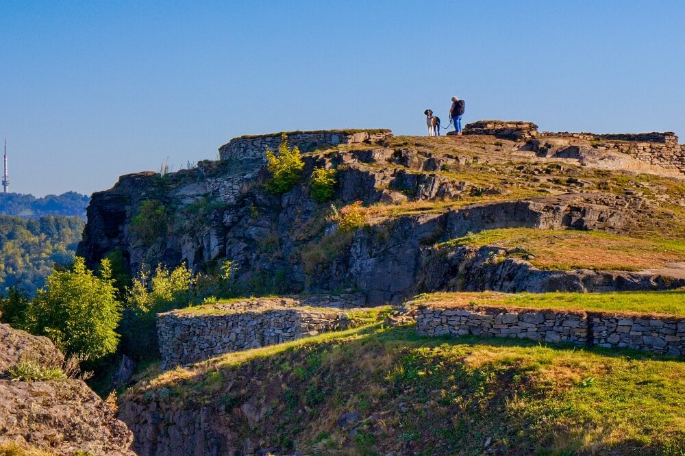 Pak drobné pochybení Yody na louce cestou - neustál běžící lišku a vyrazil (ale zůstal celou dobu na dohled) . Pak přidal dvou tryskové okruhy, aby energii vybil a zase se spořádaně vrátil a pokračoval v cestě na Pannu. Tam jsme byli sami, moc hezký kopec (hrad tam žádný k vidění není, jen pár valů, hrad byl dřevěný…) Cestou zpátky jsme potkali postupně ještě další tři psíky - ale to už bylo bez Yodích keců…