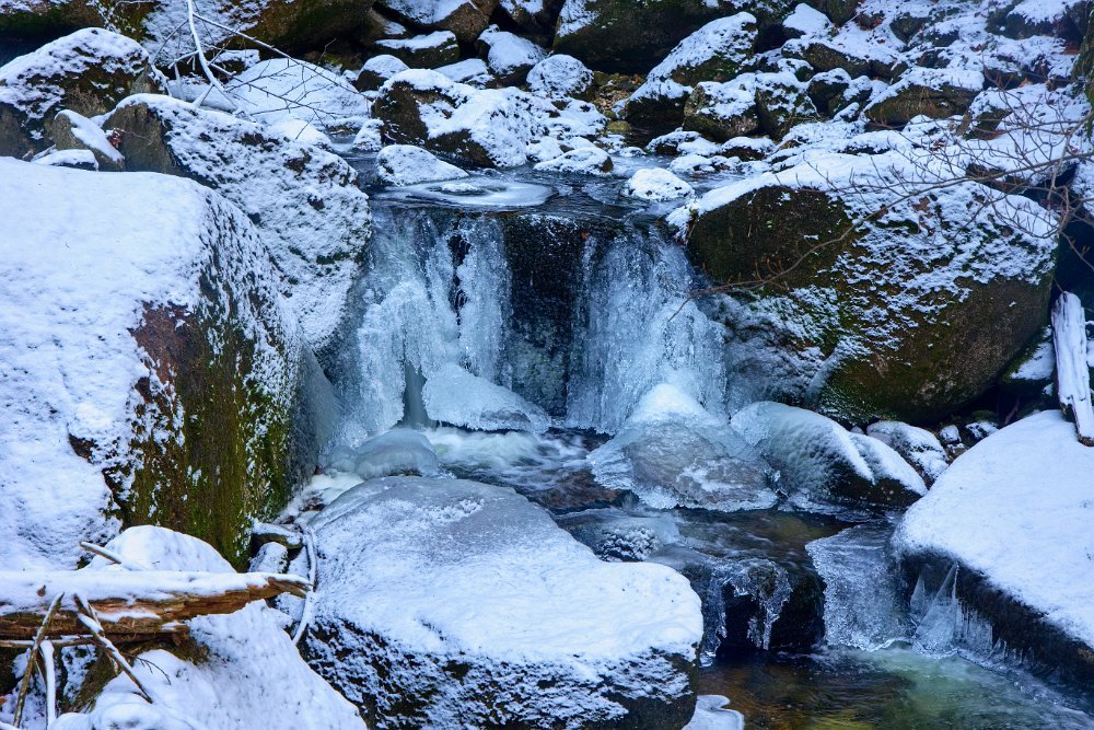 my po obědě vyjeli kousek do hor - a šli kousek údolím Hájeného potoka od Bártlovky. Něco přes hodinu - ale šli jsme pomalu, neb páník věčně někde klečel u ledopádů a fotil… Klidno, teplota kolem nuly, polojasno, poprašek sněhu na šustivém listí a pozor jsme si museli dávat jen tam, kde tekl ledopád přes cestu, aby nebyl držkopád…