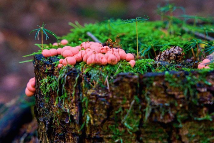 Jinak z venčení tohoto týdne. Teď jsem hledala, co jsme to v mechu na pařezu potkali za houbičky -malé kulaté svítivě růžové houbičky. A ony to nejsou houby - jsou to hlenky, které dnes patří mezi živočichy 😲 A je to vlčí mléko červené - v růžové mutaci...