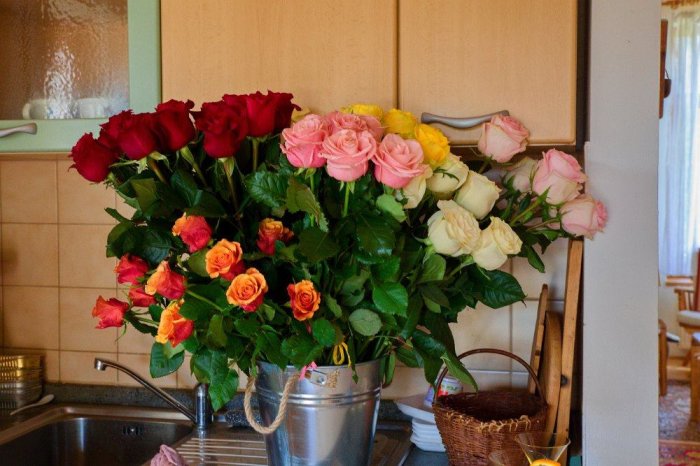 a teď ty nepsí - občas jsme kvůli vedru venčili nejen u lesních vodních ploch, ale i po tmě za měsíčku… Růže jsou babičky - dostala jich od dětí vnoučat a pravnoučat dohromady devadesát - zdaleka v tom kyblíku nejsou všechny